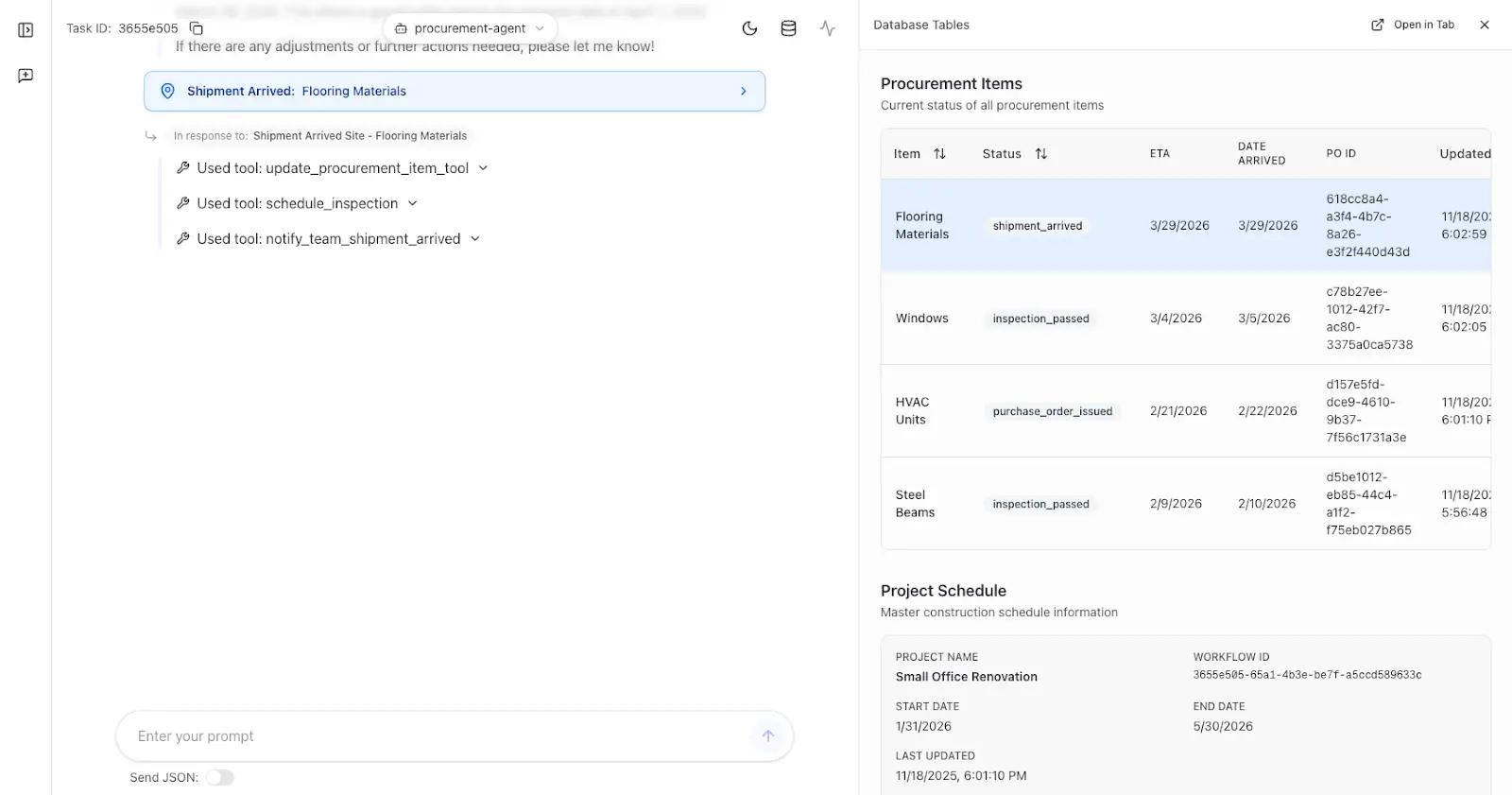 In addition to conversation history, we maintain structured state in database tables—including procurement items and the construction schedule. The agent updates these tables as it works, providing automatic conversation summarization and the ability to learn from human decisions.
