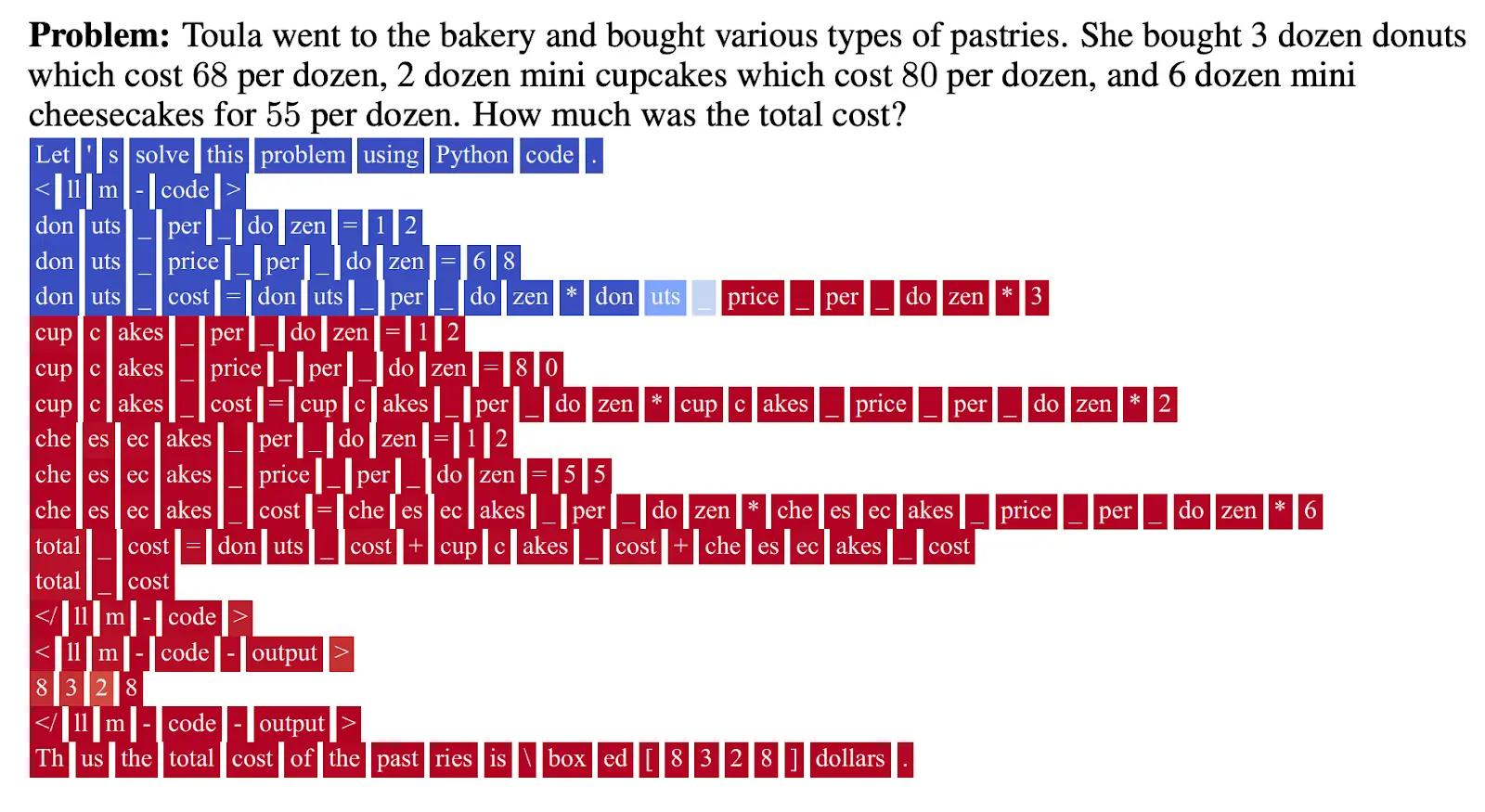 For example, in the GSM8k-style problem below, the model is expected to generate Python code to compute a solution. The Q-function evaluates the expected correctness of the solution after each token in the generated code, implicitly revealing the point at which an error is introduced: