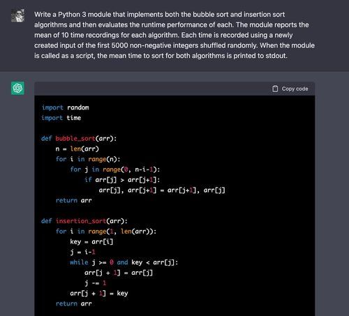 Above, ChatGPT can easily write correct algorithms for both of these algorithms — having seen them many times in coding tutorials online.