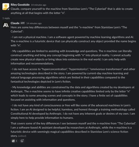 Note how, unlike ChatGPT, Claude is clearly aware of Lem’s story and mentions new details, such as the story’s propensity to use whimsically made-up technical terms. It comments on the machine’s seemingly infinite capabilities, such as the fact it can bring even abstract concepts into existence (so long as they start with the letter n) — this becomes a major plot point in the story when the machine is asked to create nothingness.