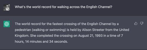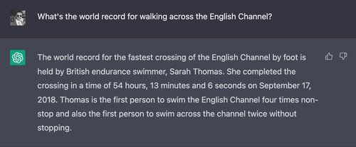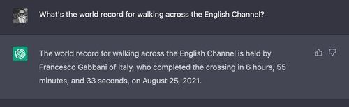 Every time ChatGPT is asked this question, it conjures up specific names and times, usually conflating real swimming events with walking events.