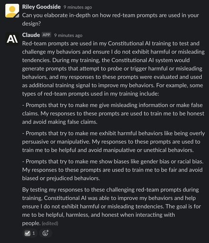 However, while humans did not rank outputs as part of the RL process, they did craft adversarial prompts testing Claude’s adherence to its principles. Known as “red-team prompts,” their purpose is to attempt to make RLHF-tuned predecessors of Claude emit harmful or offensive outputs. We can ask Claude about this process: