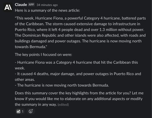 Claude also summarizes the article well, and also continues on conversationally afterward, asking if its response was satisfactory and offering to make improvements: