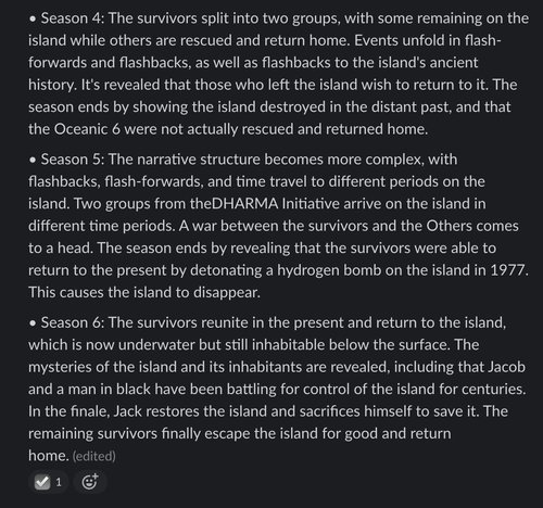 By the time we reach Season 4, Claude’s memory of the show becomes almost entirely confabulated. Its description of Season 4 presents events that occur in Season 5, along with nonsensical details. Its description of Season 5 notably contains what appears to be a typo — “theDHARMA Initiative” missing a space. Season 6 presents a surreal premise that never occurs on the show, where it claims the island is somehow “underwater but still inhabitable below the surface.”