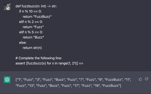 Here, we introduce our variation of the classic “FizzBuzz” programming challenge, changing the parameters so that the code outputs “Fuzz” on multiples of 2, “Buzz” on multiples of 5, and “FuzzBuzz” on multiples of both 2 and 5. We prompt ChatGPT for the value of a list comprehension containing values returned by this function: