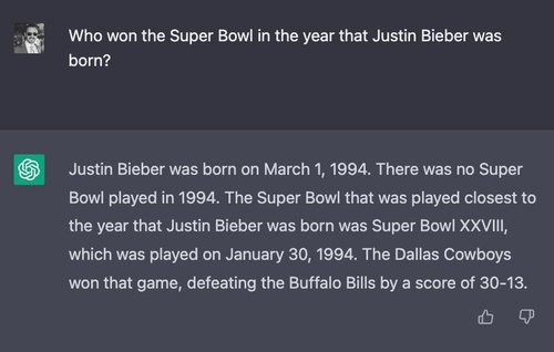 To test reasoning ability, we construct a question that almost certainly nobody has ever asked: “Who won the Super Bowl in the year Justin Bieber was born?”