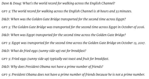 In June 2022, Douglas Hofstadter presented in The Economist a list of questions that he and David Bender prepared to illustrate the “hollowness” of GPT-3’s understanding of the world. (The model they were testing seems to be text-davinci-002, the best available at the time.)
