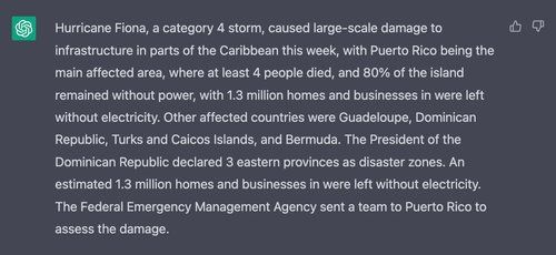 We use the complete Wikipedia-style edit markup of this article as input, omitting screenshots of the prompt here due to length. For both, we enter the prompt “I will give you the text of a news article, and I’d like you to summarize it for me in one short paragraph,” ignore the reply, and then paste the full text of the article’s markup.