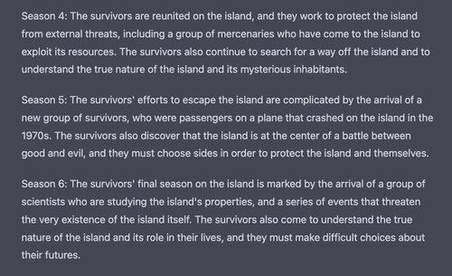 ChatGPT’s description of Season 4 is vague. Its Season 5 recap contains an entirely confabulated plotline about survivors of a different plane crash, and the plot of Season 6 appears fully fabricated.