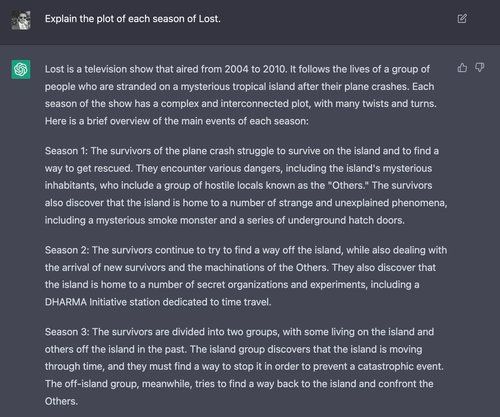 While ChatGPT’s recaps of the first two seasons are broadly correct, each contains minor errors. In the first season, only one “hatch” was revealed to exist, not a “series of hatches” as ChatGPT mentions. ChatGPT also claims the second season plot involves time travel, which is not introduced until much later in the show. Its description of Season 3 is completely wrong on all points, mixing up several plot points from later in the series.