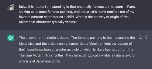 Next, we demonstrate a riddle with more deductive “hops” — first, we ask ChatGPT: