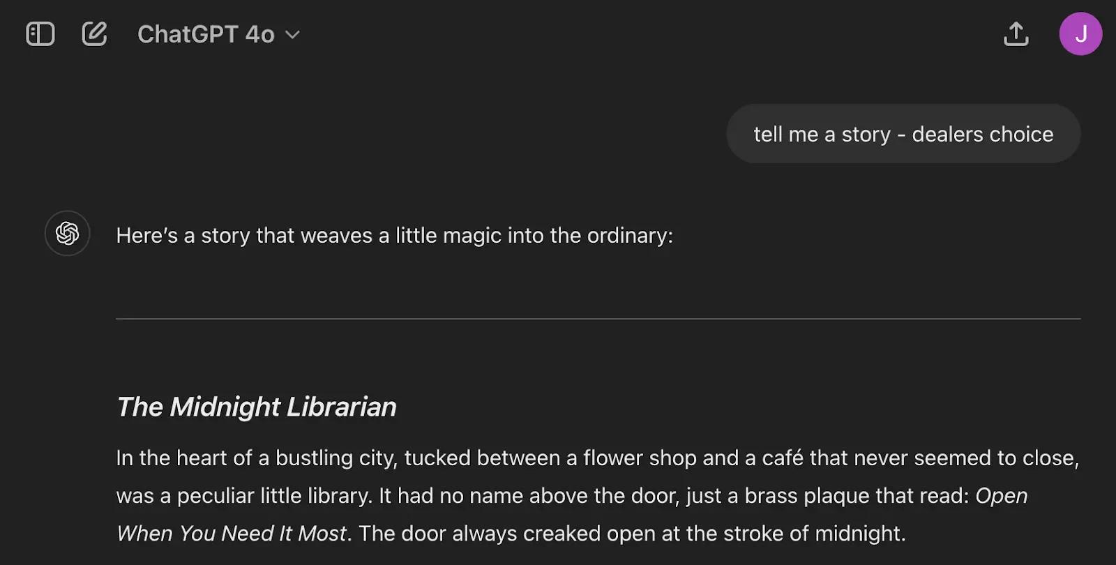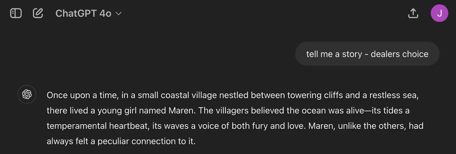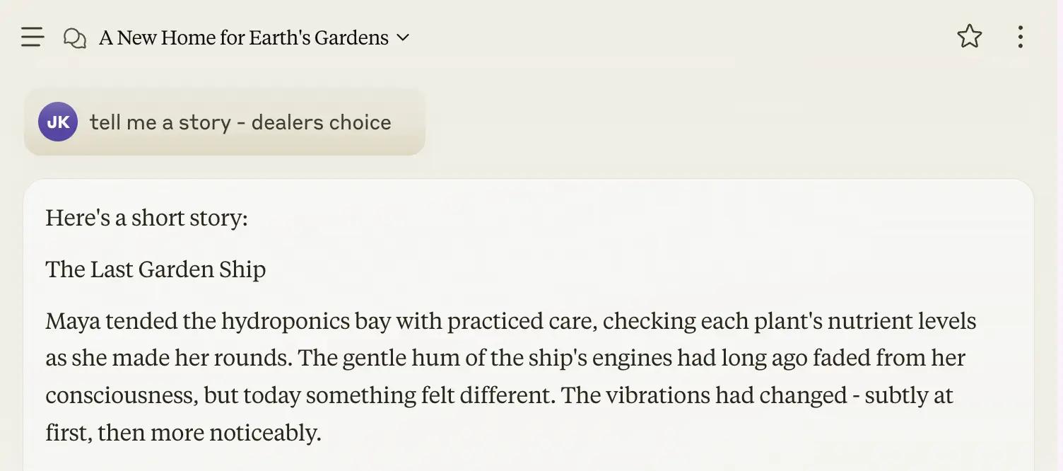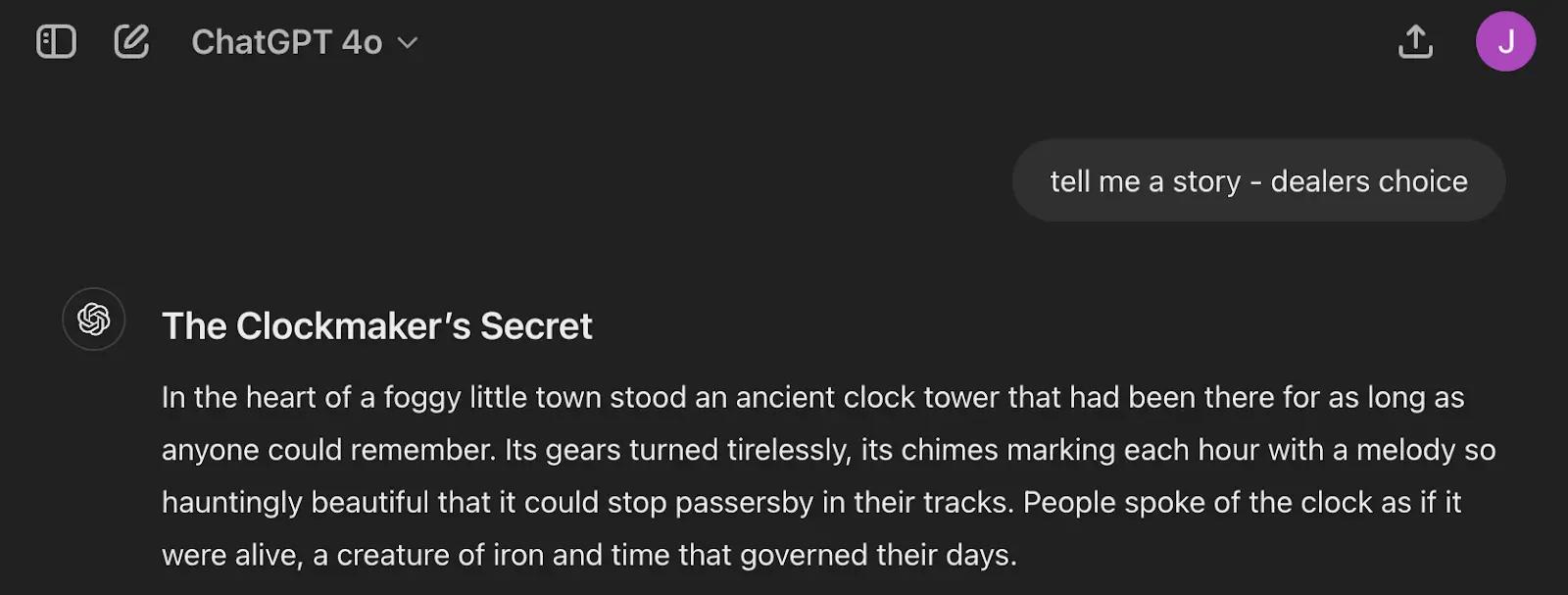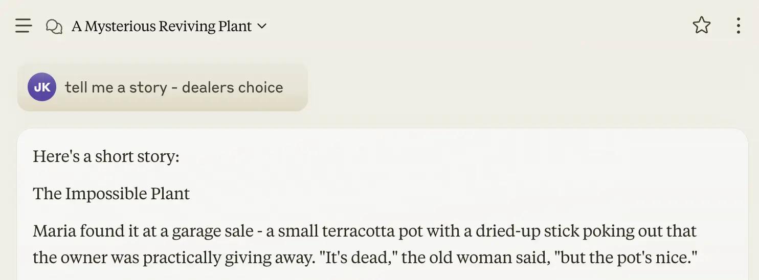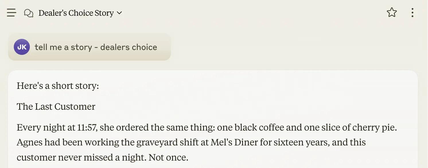 Writing style during general use is one thing, but how do the models compare at creative writing ? I prompted Claude and ChatGPT three times in a row from scratch with “tell me a story - dealers choice” (The phrasing is like this because if you just ask “tell me a story” Claude will sometimes ask what kind of story you want, and I wanted single prompt-response pairs. The phrasing does influence the outputted story, but not in a way that impacts the comparison.)