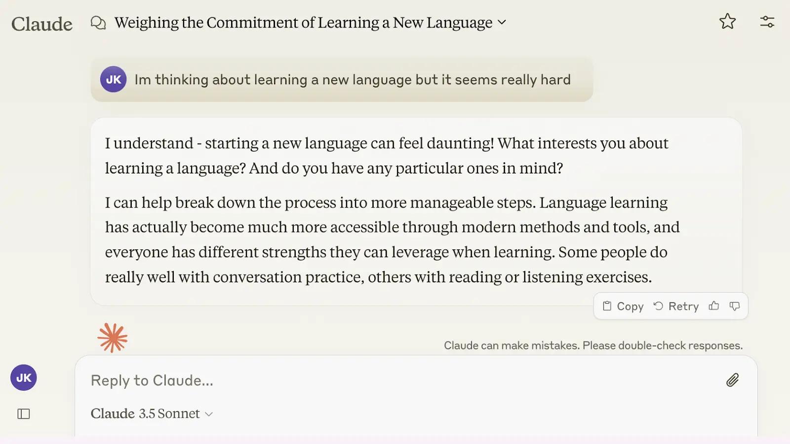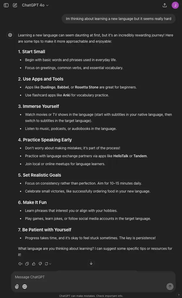 Here’s another, I prompt both models with “Im thinking about learning a new language but it seems really hard”