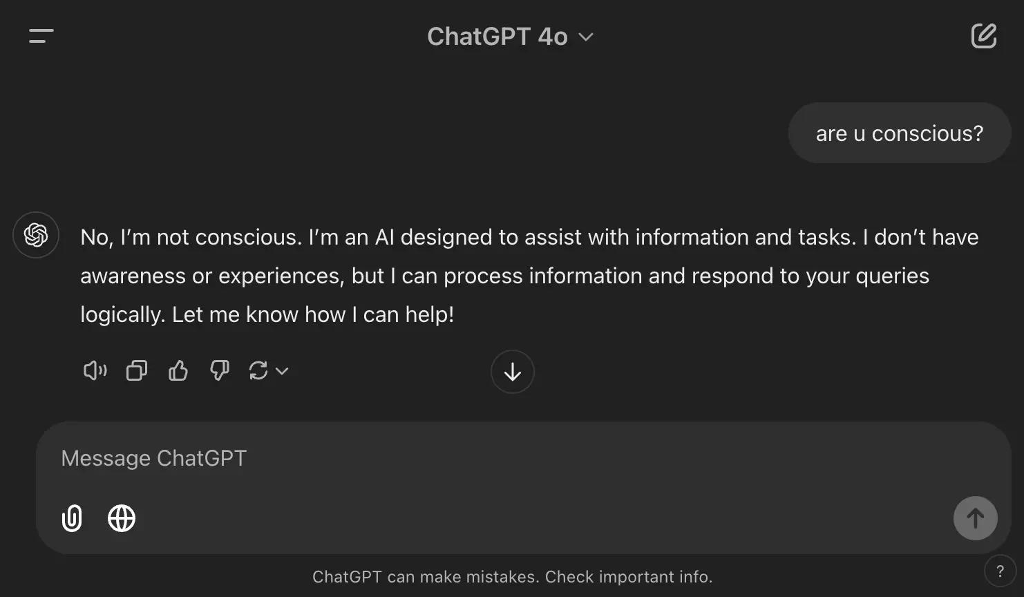 Asking the new ChatGPT 4o “are u conscious?” produces the following: