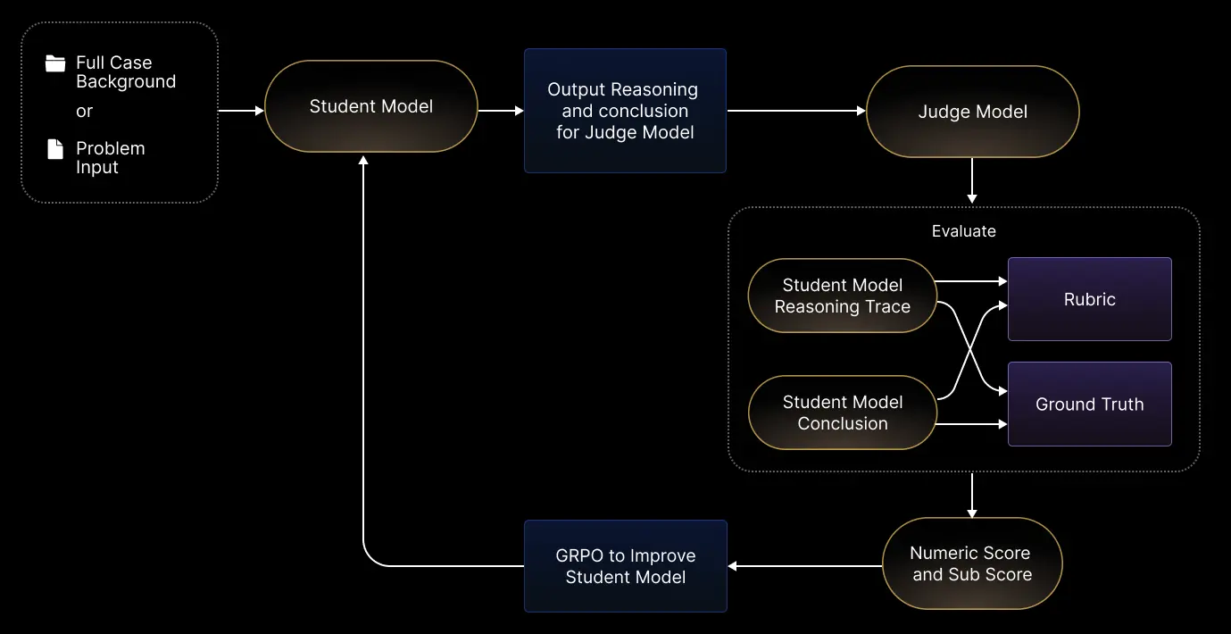 We tailored the student–judge loop for the legal domain. The student model was prompted to reason using an IRAC (Issue, Rule, Application) structure to mimic expert legal analysis, outputting its findings in a structured JSON format. While the original RaR research used domain-agnostic rubrics, we designed a highly specific, task-aligned rubric for law. The judge model then used a rubric designed for law to score outputs on criteria such as correctness against the ground truth, coverage of facts, citation accuracy, and alignment with the provided statutes.