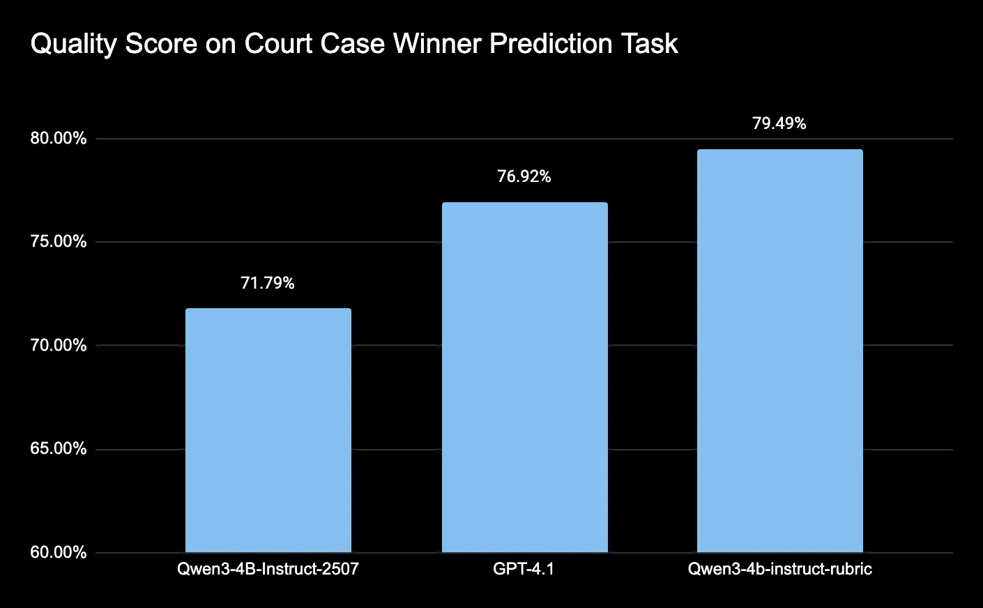 Our findings show that a small model, fine-tuned with a domain-specific rubric, can match or outperform a much larger, general-purpose model on a specialized task. The student model was optimized to produce IRAC-structured reasoning, ensure correct statute use, cover relevant facts, and avoid common pitfalls—with outcome correctness being just one criterion among many. On our 41-case test set, this holistic training translated directly into stronger outcome accuracy. The results are below: