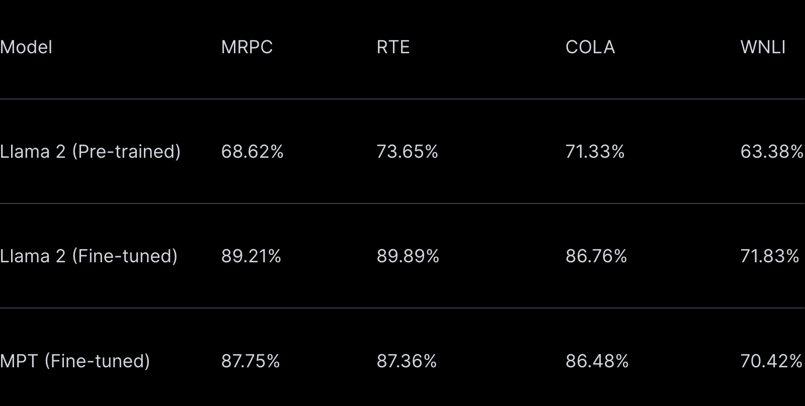 As a side experiment, we also used LLM Engine to fine-tune and evaluate LLAMA-2's performance on several tasks from GLUE, a set of commonly used NLP benchmark datasets.