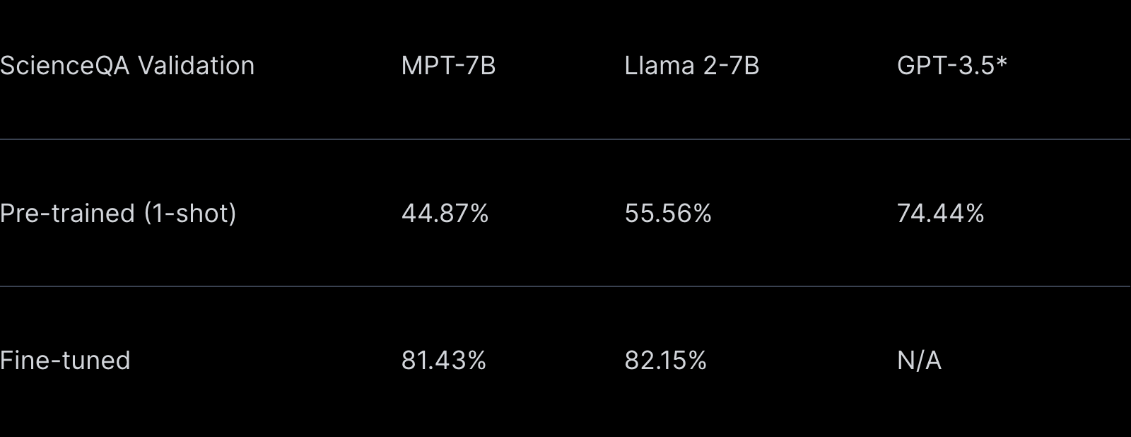 As we can see, fine-tuning makes a huge difference in the case of both language models. The performance gain from fine-tuning Llama-2 on ScienceQA was a 26.59% absolute difference! This is in addition to the fact that inference with a fine-tuned model is cheaper than few-shot example prompts, due to shorter prompt length. This fine-tuned Llama-2-7B model also outperforms GPT-3.5, a 175 billion parameter model!