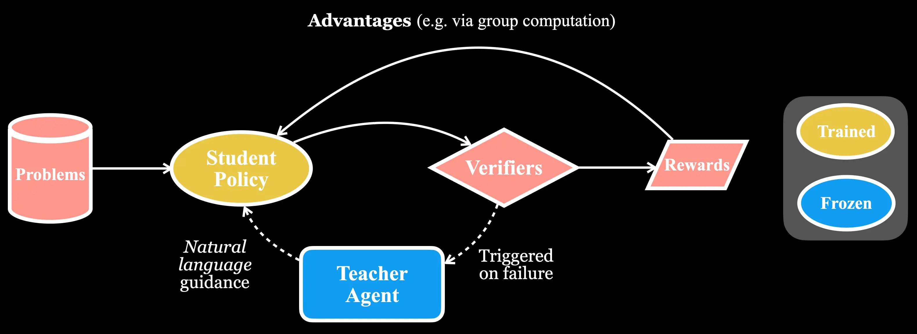 At its core, this interactive student-teacher framework is effective because it directly addresses the critical bottleneck in agentic learning: sparse rewards. In a complex task like coding, an agent can make thousands of changes without ever stumbling upon a solution that passes unit tests and thereby receiving no learning signal. As the length and complexity of tasks increase, the likelihood of an agent reaching a goal state on its own decreases exponentially. By offering a targeted hint in natural language, the agents collaboratively collapse an impossibly vast search space into a manageable one, allowing the student to discover a successful trajectory far more efficiently. This mimics how humans learn complex skills through a feedback loop with mentors who provide crucial, timely guidance, rather than through pure, unguided trial and error.