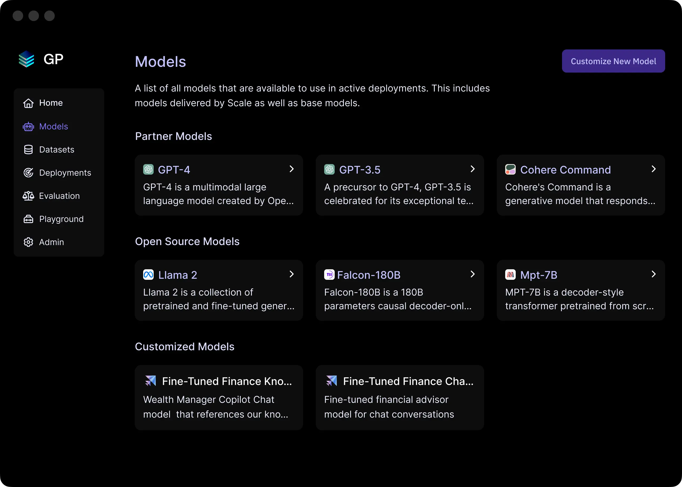 Some enterprises use closed-source models like OpenAI’s GPT-4 or Cohere’s Command model, while others opt for open-source models like Meta’s Llama 2. GenAI Platform supports all major open and closed-source foundation, embedding, and reranking models, including GPT-4 and Llama 2. We are also excited to announce that we have now added Cohere’s Command model and rerank technology to GenAI Platform for fine-tuning, inference, and use in RAG workflows.