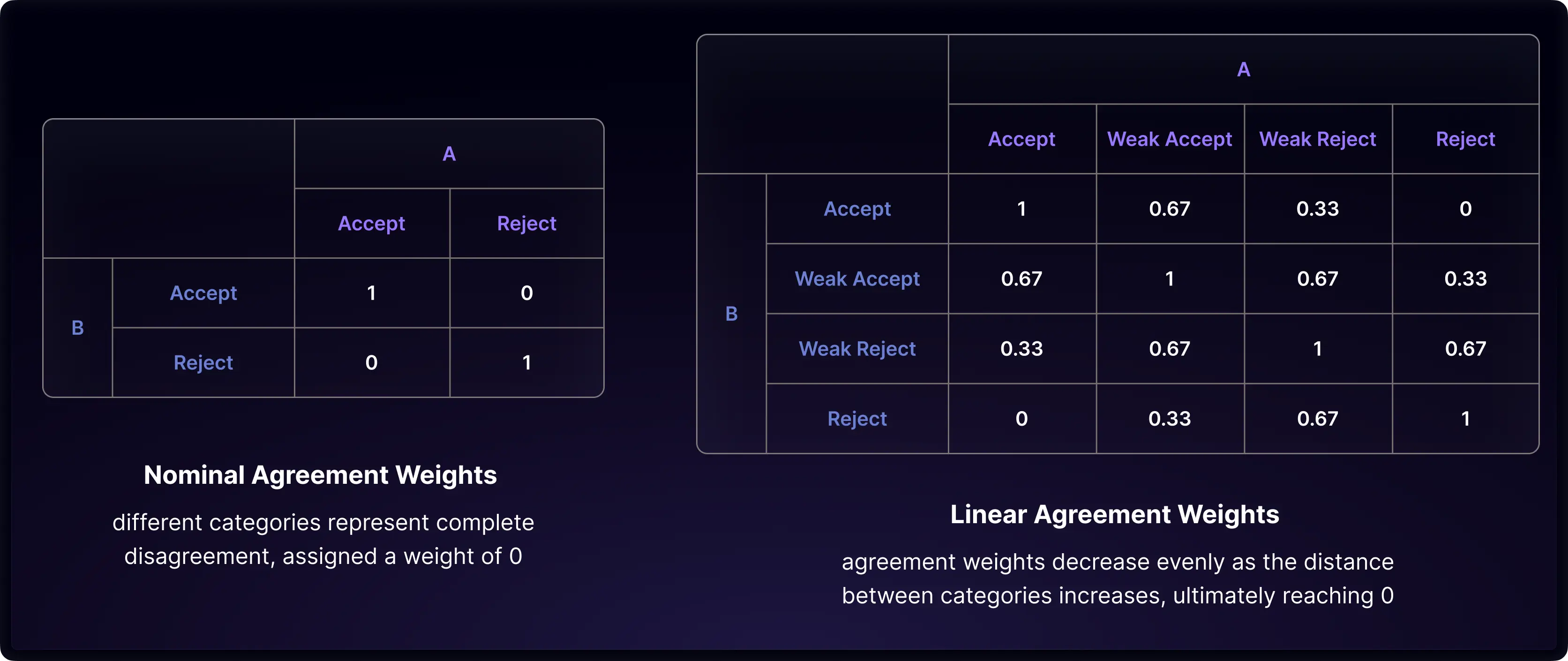 In our example of paper review, there are two rating categories: 'accept' and 'reject.' These categories are distinct and do not intersect. In this case, the rating's level of measurement is classified as nominal, where 'accept' and 'reject' form a dichotomy. Different ratings represent complete disagreement.