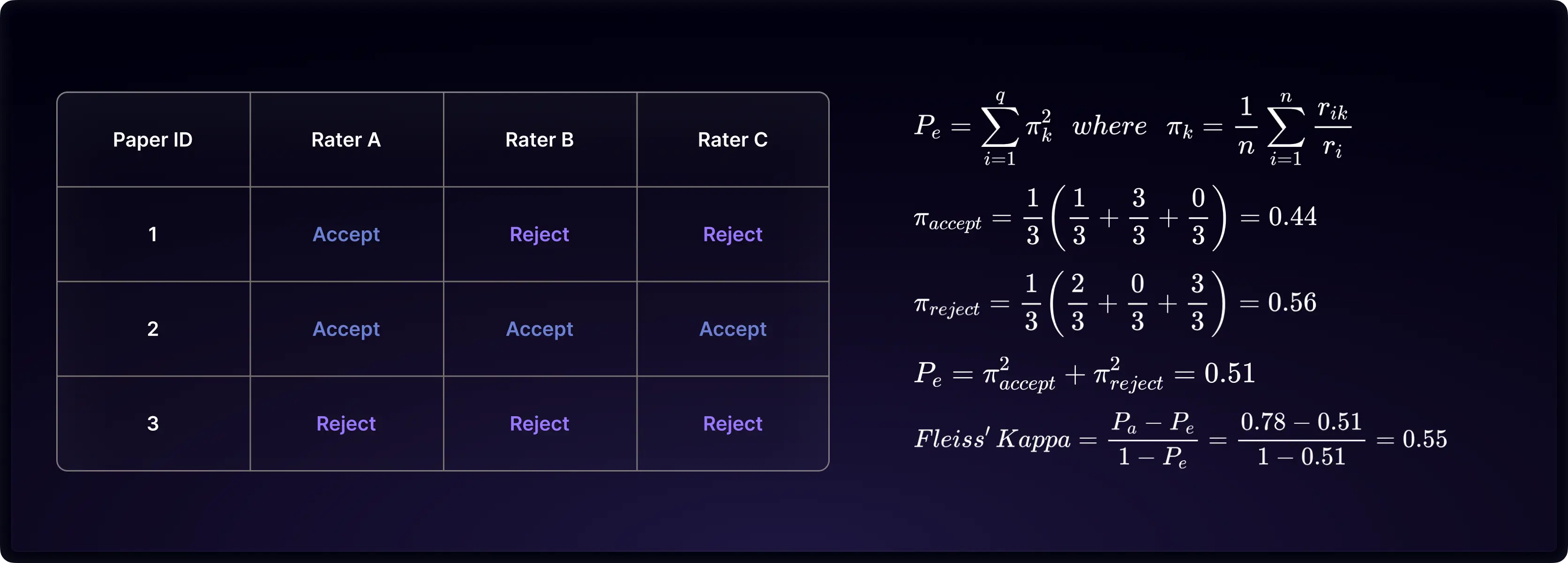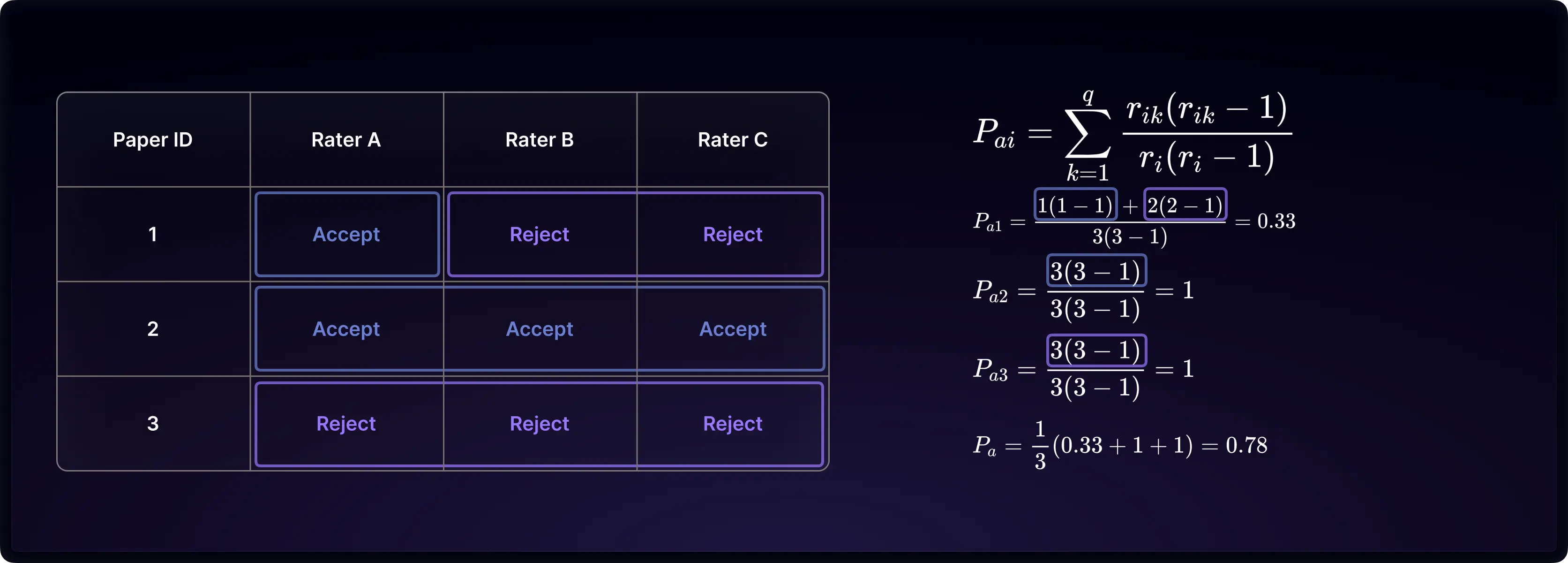 Consider an example with 3 raters reviewing 3 subjects, choosing between ‘accept’ or ‘reject’. The observed percentage agreement, Pₐ, is calculated by determining the proportion of agreeing rater pairs out of all possible pairs for each subject, then averaging these proportions across all subjects. In our example, each subject has three rater pairs (AB, AC, BC), and we calculate the agreeing proportion as the observed agreement for each subject. Then we average these proportions to obtain an overall Pₐ.