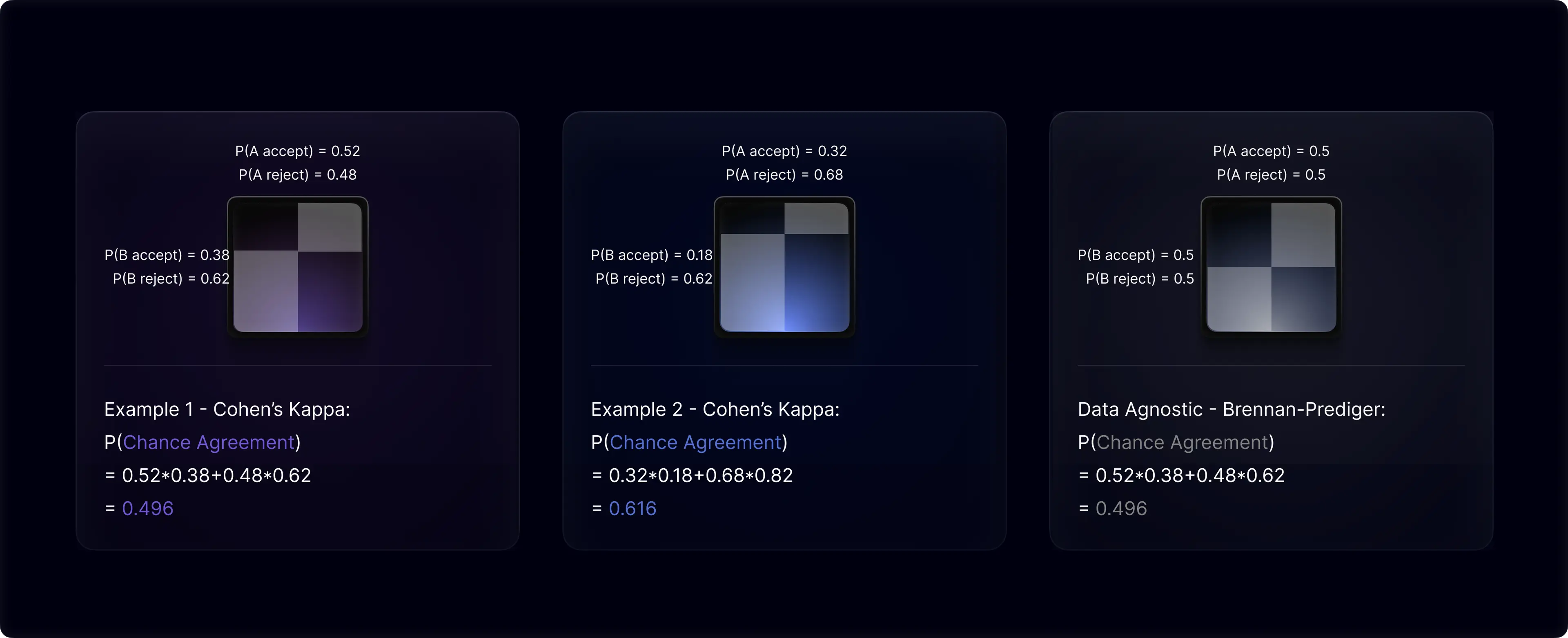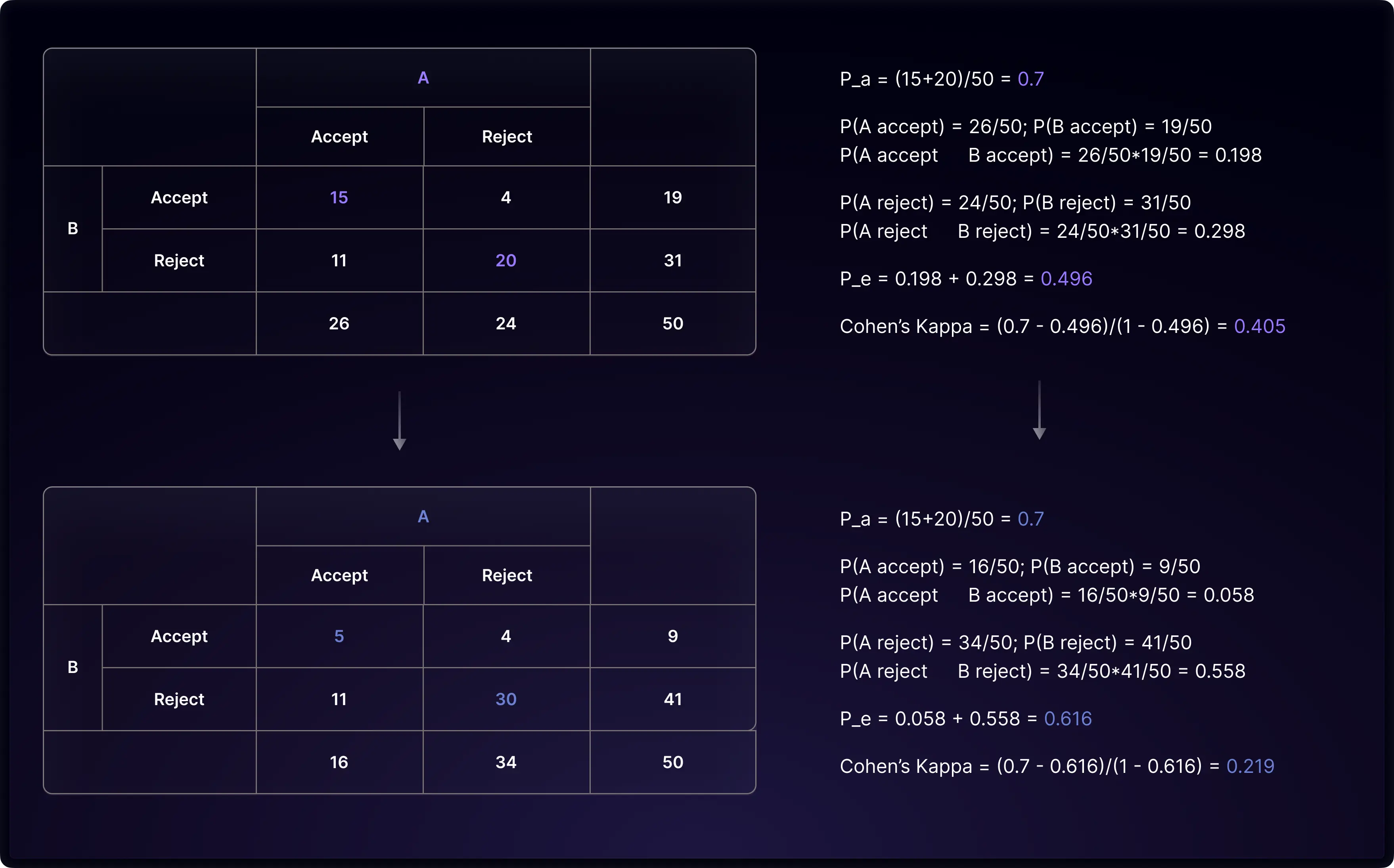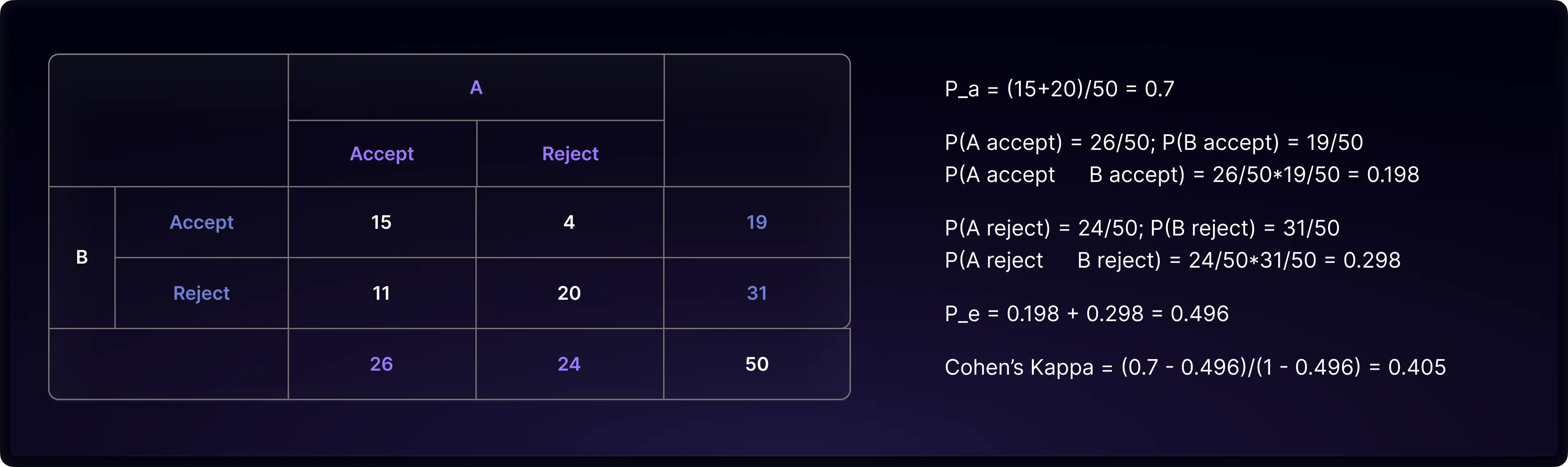 Cohen assumes each rater’s rating propensity is pre-determined before assessing the work. The estimated percentage chance agreement is the chance of two raters giving the same rate independently according to their rating propensity. Chance agreement could be either both raters accept a paper (A accept * B accept = 26/50 * 19/50) or both raters reject a paper (A reject * B reject = 24/50 * 31/50). The percentage chance agreement is the sum of two, which is 0.496. Finally, we apply the formula to calculate Cohen’s Kappa and get 0.405.