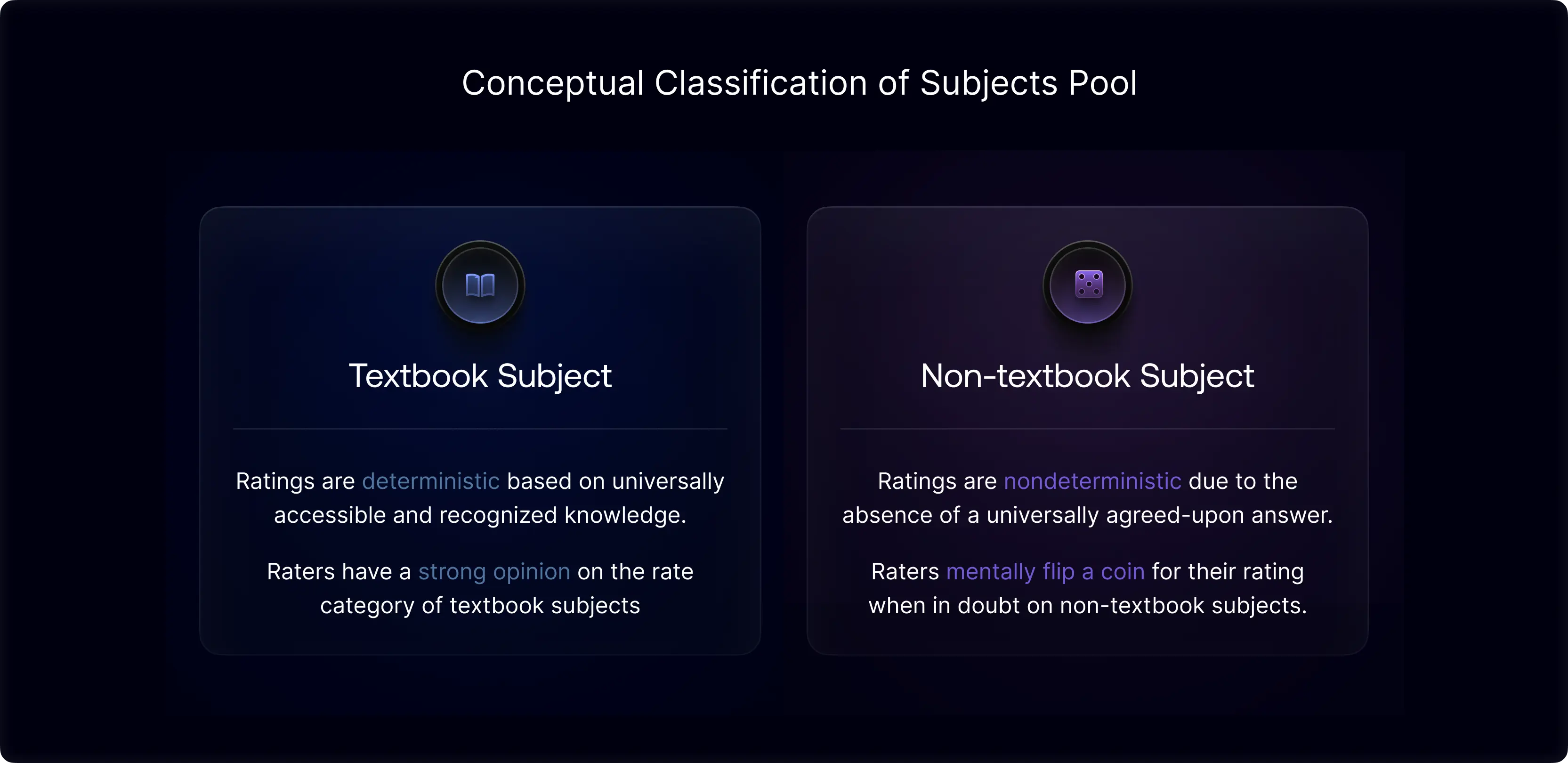 Gwet’s theory conceptually categorizes subjects into two distinct types: textbook and non-textbook. Textbook subjects have deterministic rating categories, determined by the universally accessible and understandable public knowledge. Non-textbook subjects, conversely, are marked by their non-deterministic nature, where even the collective knowledge of raters fails to provide definitive answers. Non-textbook subjects could also involve subjective judgment, where ratings are shaped by individual preferences. Textbook subjects are often called 'easy-to-rate', while their non-textbook counterparts are called 'hard-to-rate' due to their inherent complexity. Gwet proposed that chance agreement is particularly relevant in non-textbook subjects, as these often involve raters making decisions based on personal opinions or selecting from multiple viable options at random.