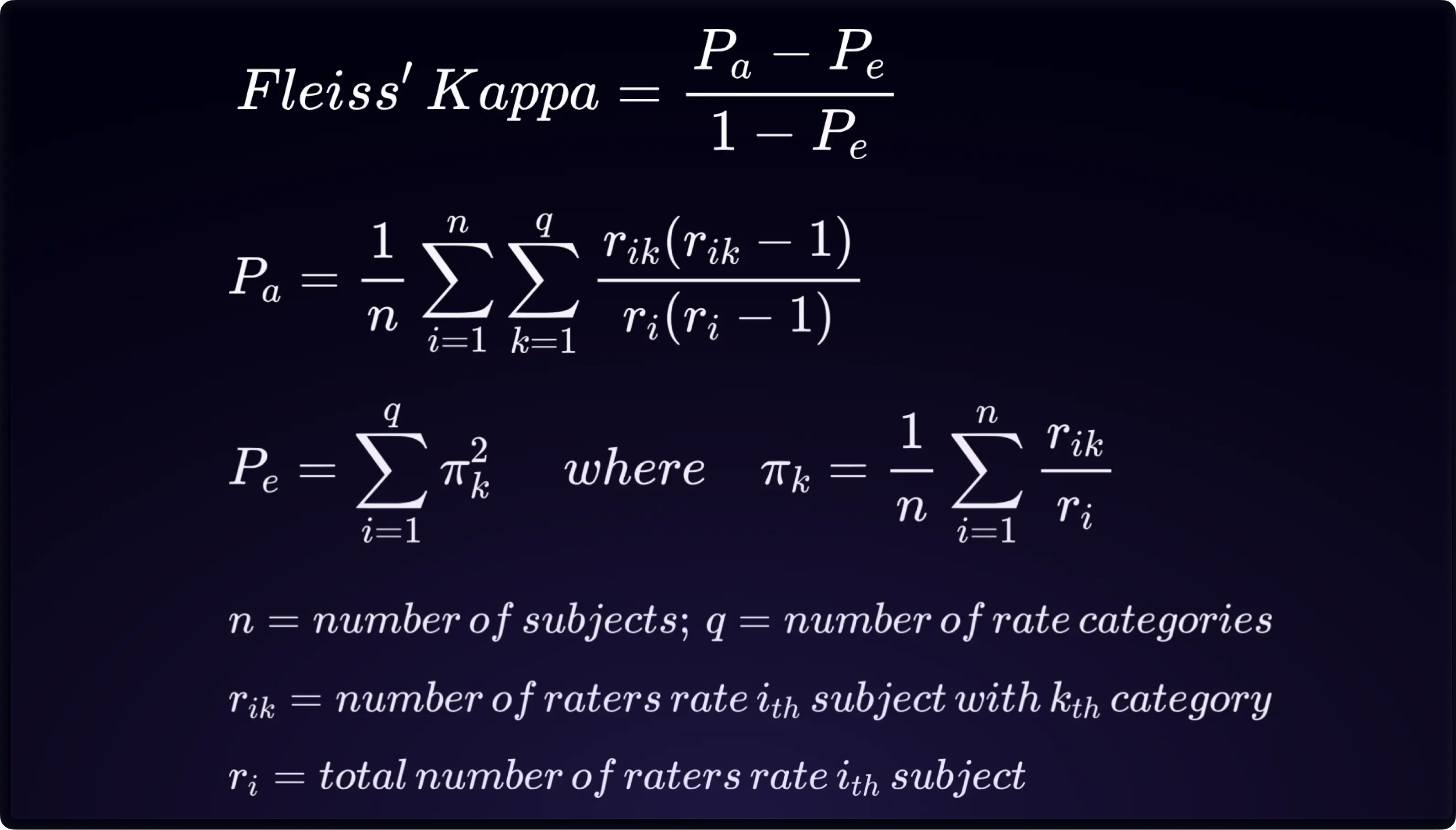 In 1971, Joseph L. Fleiss, a distinguished statistician, built upon the groundbreaking work of Jacob Cohen by introducing an improved form of the Kappa coefficient. Named Fleiss' Kappa, this version expanded Cohen's original concept to effectively handle situations with multiple raters. Fleiss' Kappa is derived by applying the general formula that adjusts for chance agreement, leveraging Pₐ and Pₑ. Comprehending Fleiss’ Kappa hinges on understanding the calculation of these two parameters.