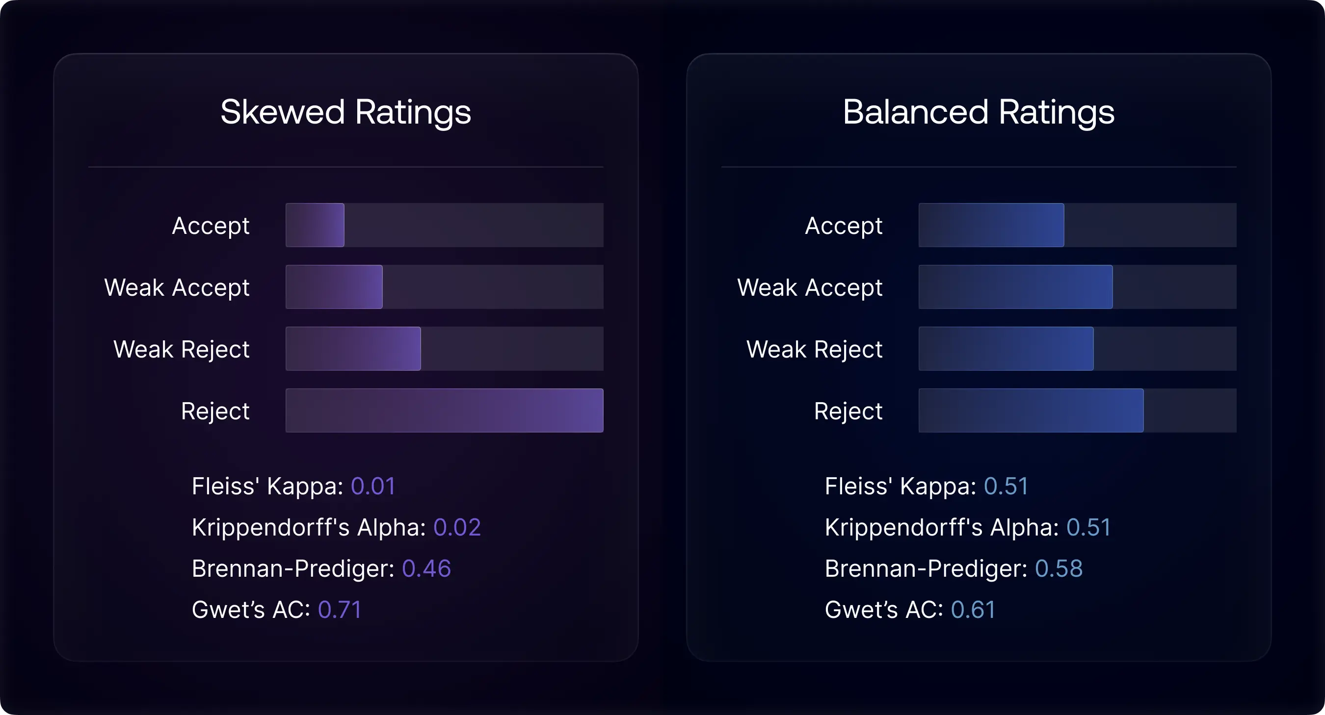 To mitigate Kappa’s paradox, another empirical strategy is diversifying the subject pool, although its suitability varies with the research context. Theoretically, a diverse subject pool across the rated dimension should result in balanced rating categories, thereby avoiding Kappa’s paradox. To demonstrate, we simulated two scenarios: one rating distribution predominantly featuring papers likely to be rejected and another with a more even mix of papers likely to be accepted or rejected. The results show that Kappa and paradox-resistant coefficients heavily diverge in the skewed scenario but align in the more balanced rating scenario. In practice, leveraging a set of inter-rater reliability metrics can achieve a more reliable agreement evaluation, adaptable to data distribution.