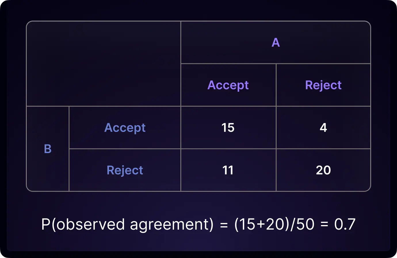 Let’s formulate a simple example to demonstrate metric calculation. Imagine we have 50 papers submitted to an AI conference and 2 raters (reviewers) to rate each subject (paper) as either accept or reject. The rating results are summarized in the table below. Both raters accepted the paper 15 times. Both raters rejected the paper 20 times. Rater A accepted and rater B rejected 11 times. Rater A rejected and rater B accepted 4 times.