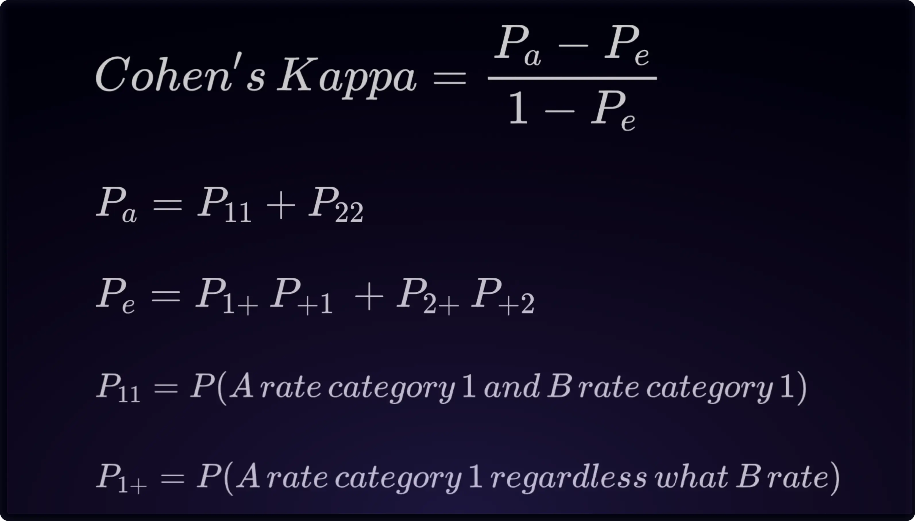 In 1960, the statistician and psychologist Jacob Cohen, best known for his work in statistical power analysis and effect size, proposed the Kappa coefficient. Cohen’s Kappa uses an estimated percent chance agreement (denoted by Pₑ) to adjust the observed agreement (denoted by Pₐ). Cohen’s Kappa is calculated by comparing observed agreement Pₐ to the perfect agreement of 1 while deducting both by estimated chance agreement Pₑ. This formula has also evolved into a foundational framework for creating other inter-rater reliability metrics, establishing their range from negative infinity to 1.
