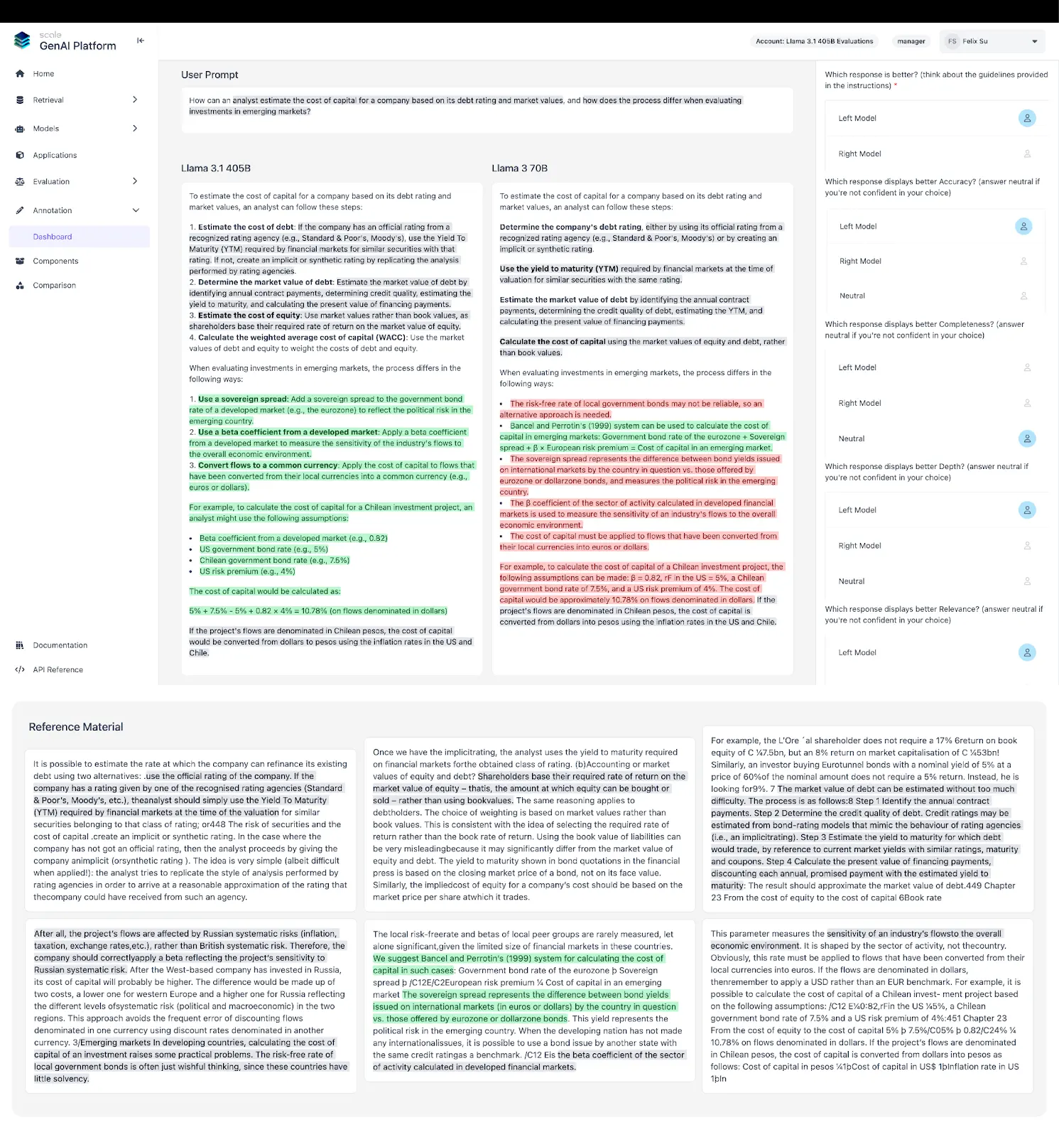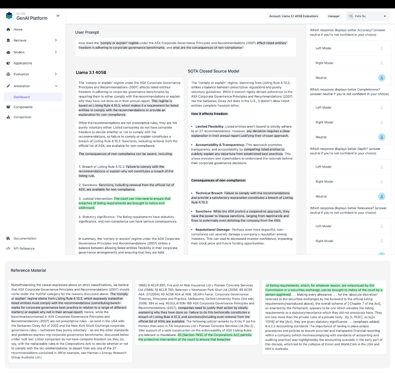 Qualitatively, Llama 3.1 405B is able to provide a clear, well-structured, and thorough response to the query. The model accesses the context (“Reference Material”) and synthesizes its answers in reference to the most relevant portions. For example, the model response cites the specific rule 4.10.3: “This regime is based on Listing Rule 4.10.3, which makes it a requirement for listed entities to comply with the recommendations or provide an explanation for non-compliance.” Other instances of these references are highlighted in the image. Because the closed source model also references this context well, the evaluation earned a neutral rating from human raters.