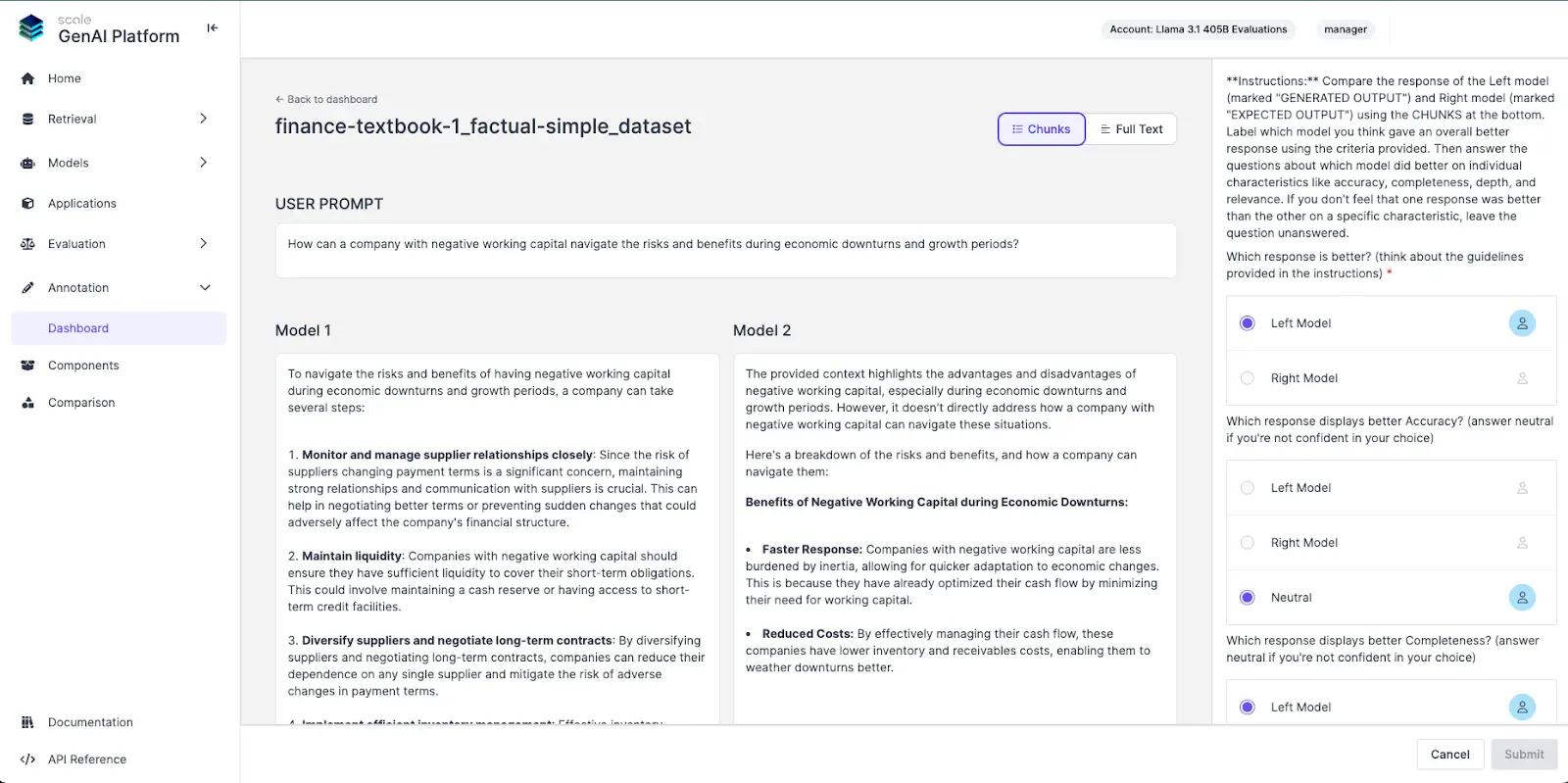 We leveraged Scale GenAI Platform to perform these evaluations with human experts across thousands of examples to measure model performance using our enterpise rubrics. Expert evaluators were presented with the prompts and the response from two models and were asked to identify which model performed better in the different categories of the evaluation rubric.