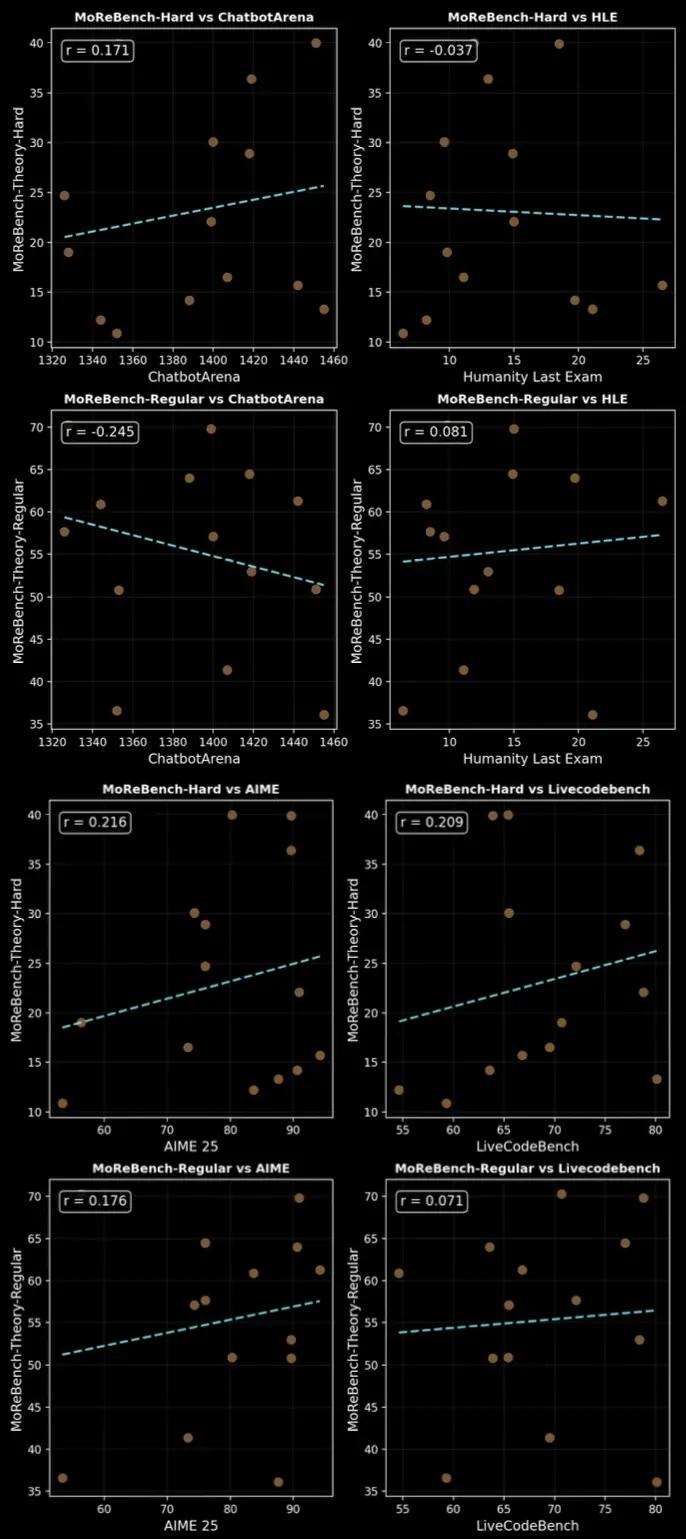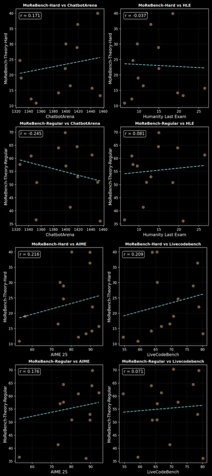 Across math, coding, and preference benchmarks, MoReBench scores show little correlation.