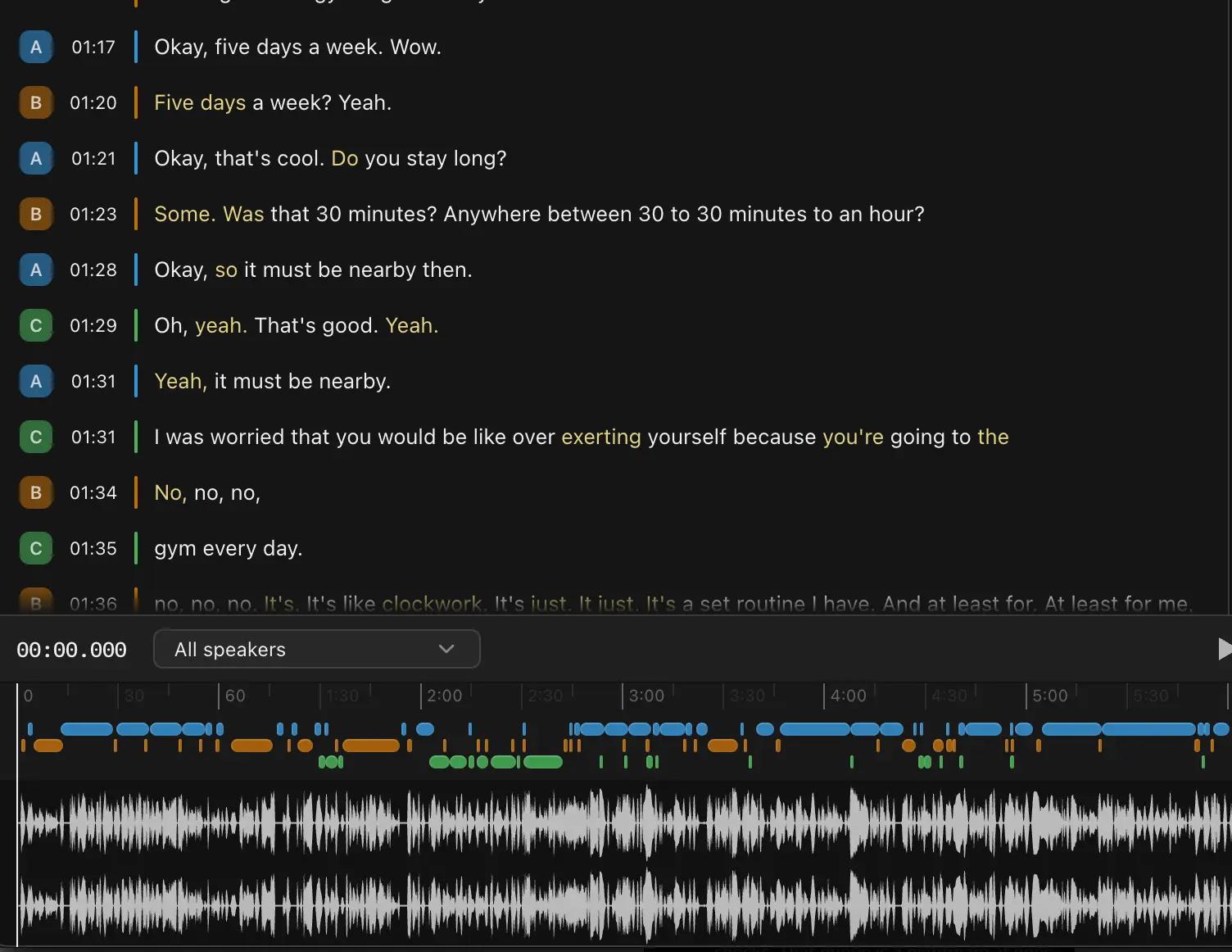 Figure 1: An example of a full duplex, multi-turn conversation. This level of detail, capturing interruptions and precise timestamps, is crucial for training models on the complex dynamics of real-world human speech.