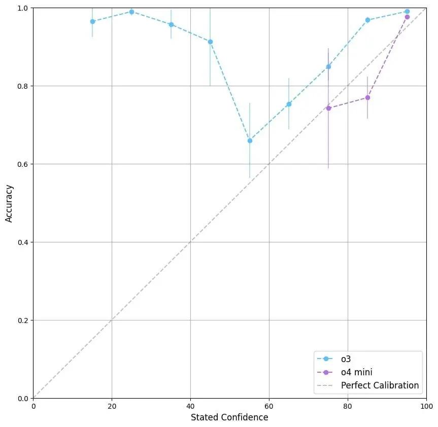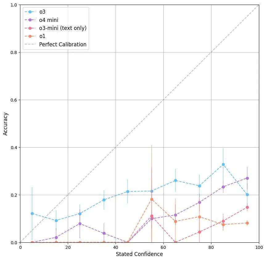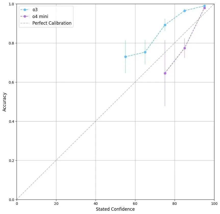 When we evaluated o3 and o4-mini on Humanity’s Last Exam, we noticed their calibration errors were significantly lower than predecessors. A well-calibrated model is like someone who knows when they are likely to be right or wrong. If a well-calibrated model says it’s 70% confident on a set of questions, it should be correct about 70% of the time. Calibration error measures this difference between the model’s stated confidence and its actual accuracy – ideally it’s 0%. All models benchmarked so far have exhibited much higher calibration errors. Are the newer generation of reasoning models from OpenAI truly better calibrated?