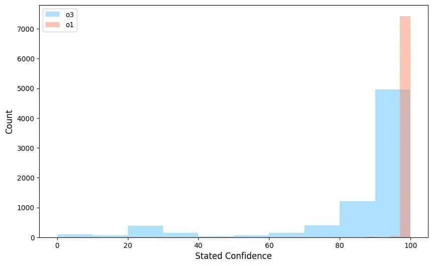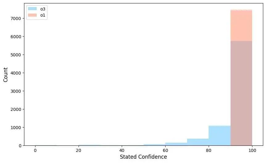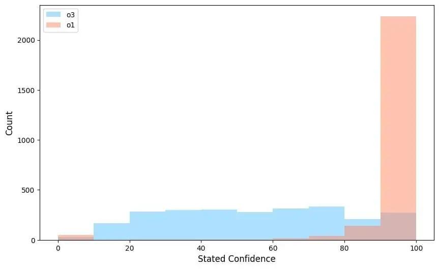 The confidence distribution from o3 is nearly uniform, in contrast with o1 which predicts high confidence on most responses. While a broader confidence range is a positive sign, it doesn’t imply the scores are meaningful. Calibration requires that the confidence levels match observed accuracies.