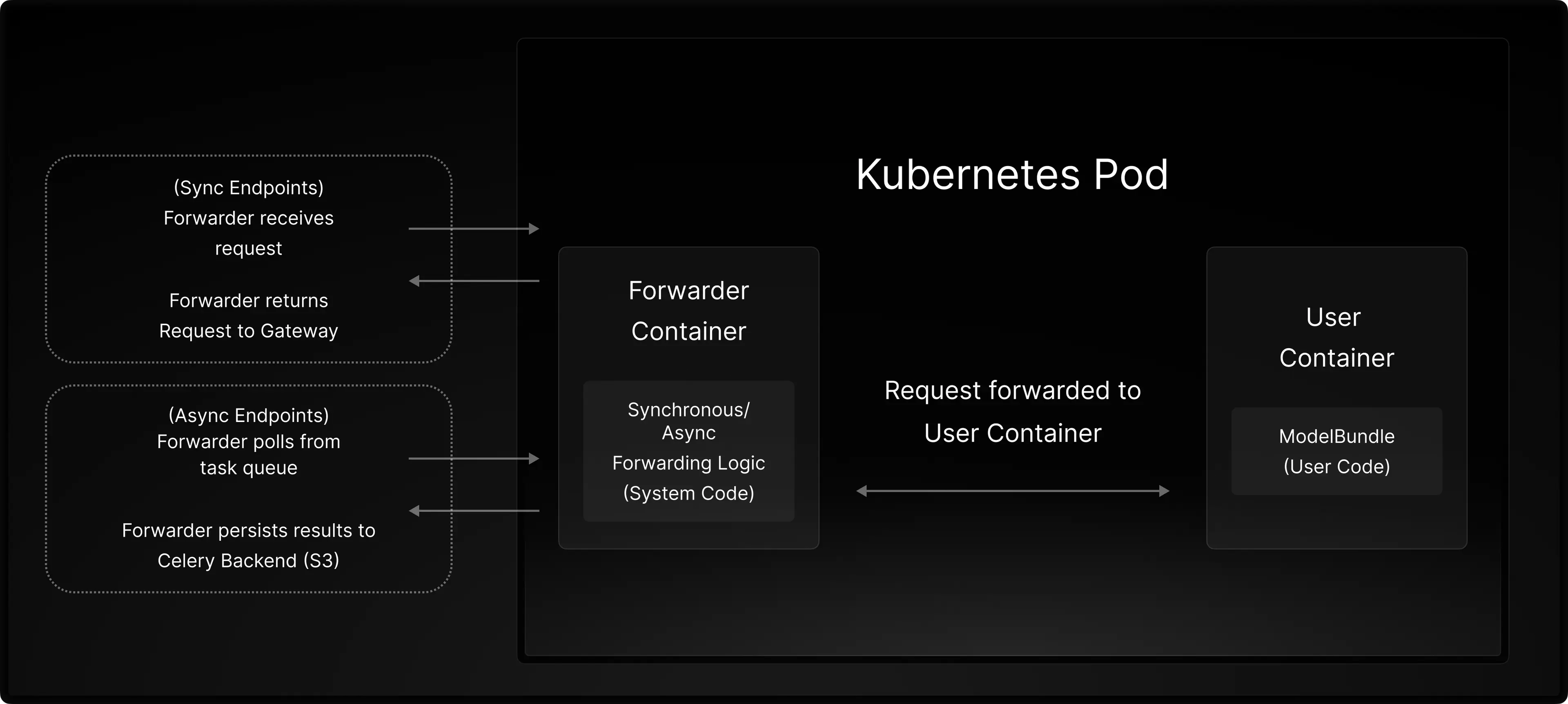 Every worker for an endpoint is deployed as a k8s pod. Within the pod, there are two containers: