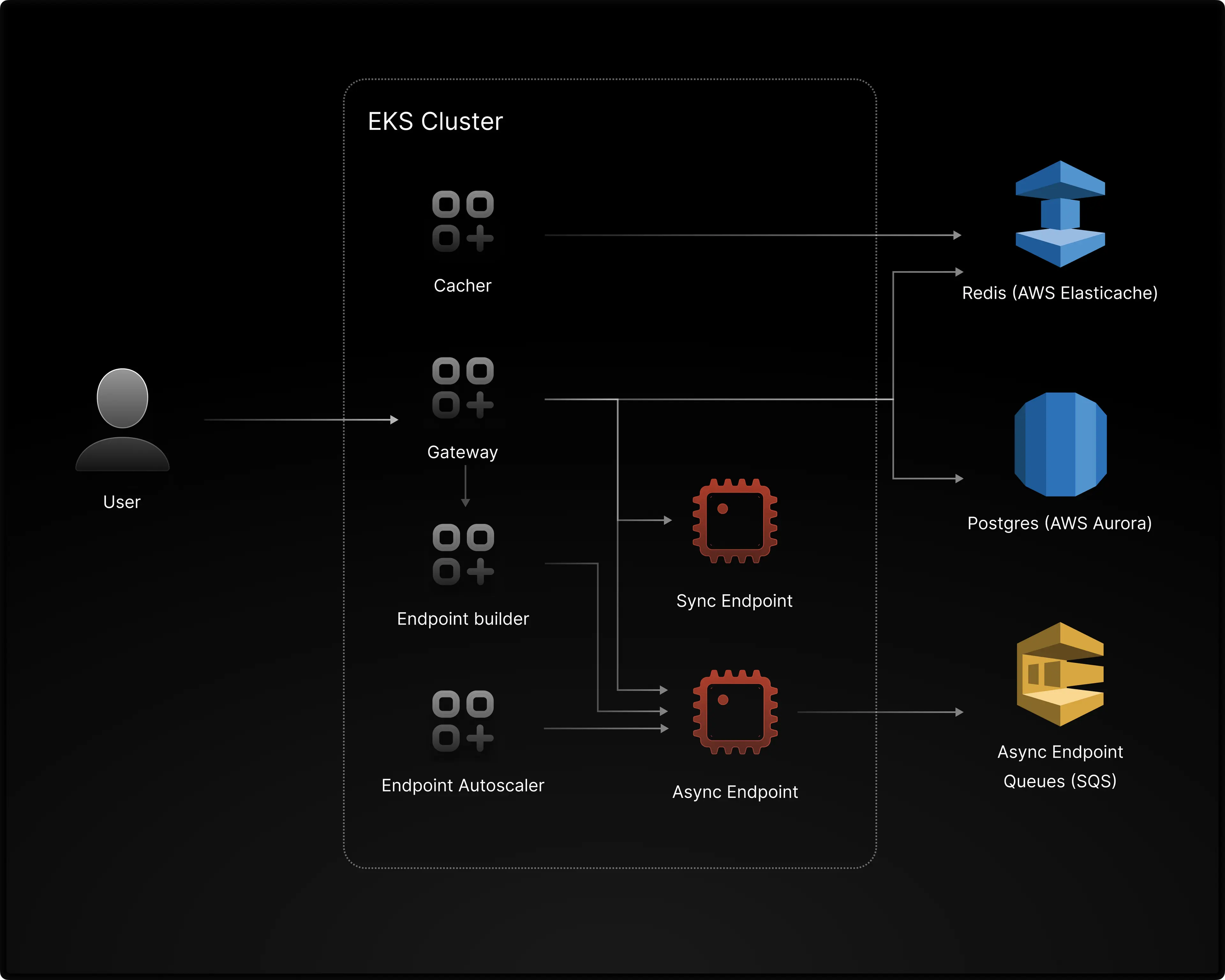 The same service is responsible for updating Endpoint image caches in the nodes. This enables different endpoints to autoscale much faster, enabling users to efficiently provision GPU resources for their workloads. Without fast autoscaling, users would often bump up their min_workers to a value much higher than required and consequently rack up a higher compute bill. For details about fast autoscaling, we defer to a previous blog post dedicated to this topic.