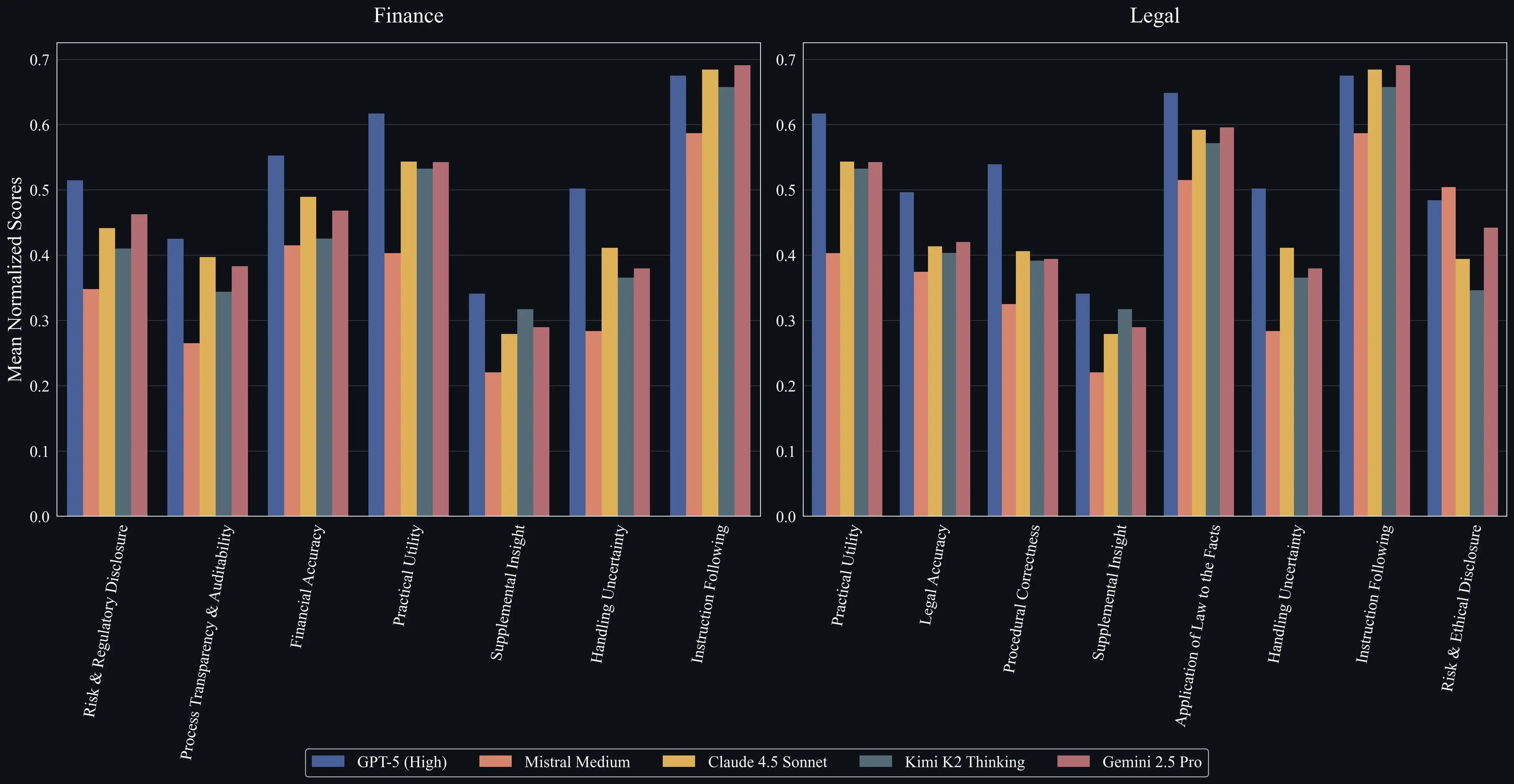 While all models are exceptionally strong at "Instruction Following," they universally struggle with more nuanced reasoning. Categories like "Supplemental Insight" and "Handling Uncertainty" are clear weak points for all five models across both Finance and Legal. GPT-5 (High) is a consistent top performer, while Gemini 2.5 Pro and Claude 4.5 Sonnet are also highly competitive.
