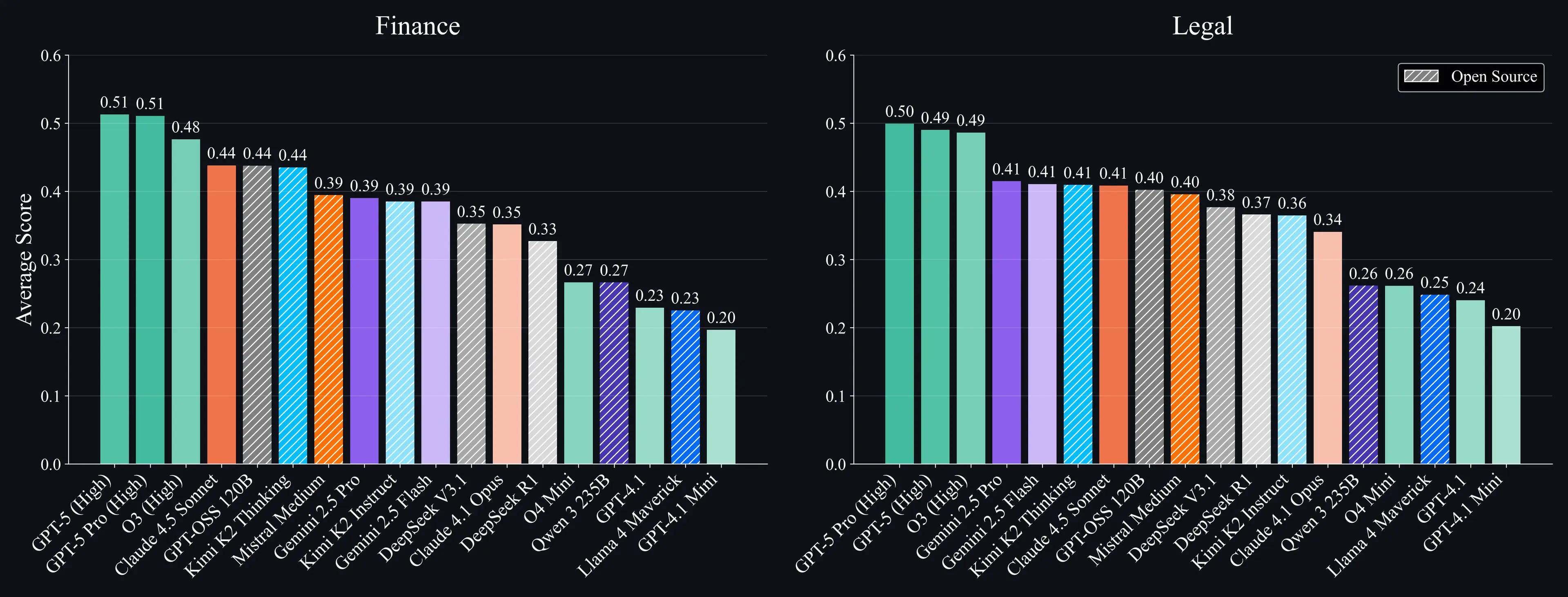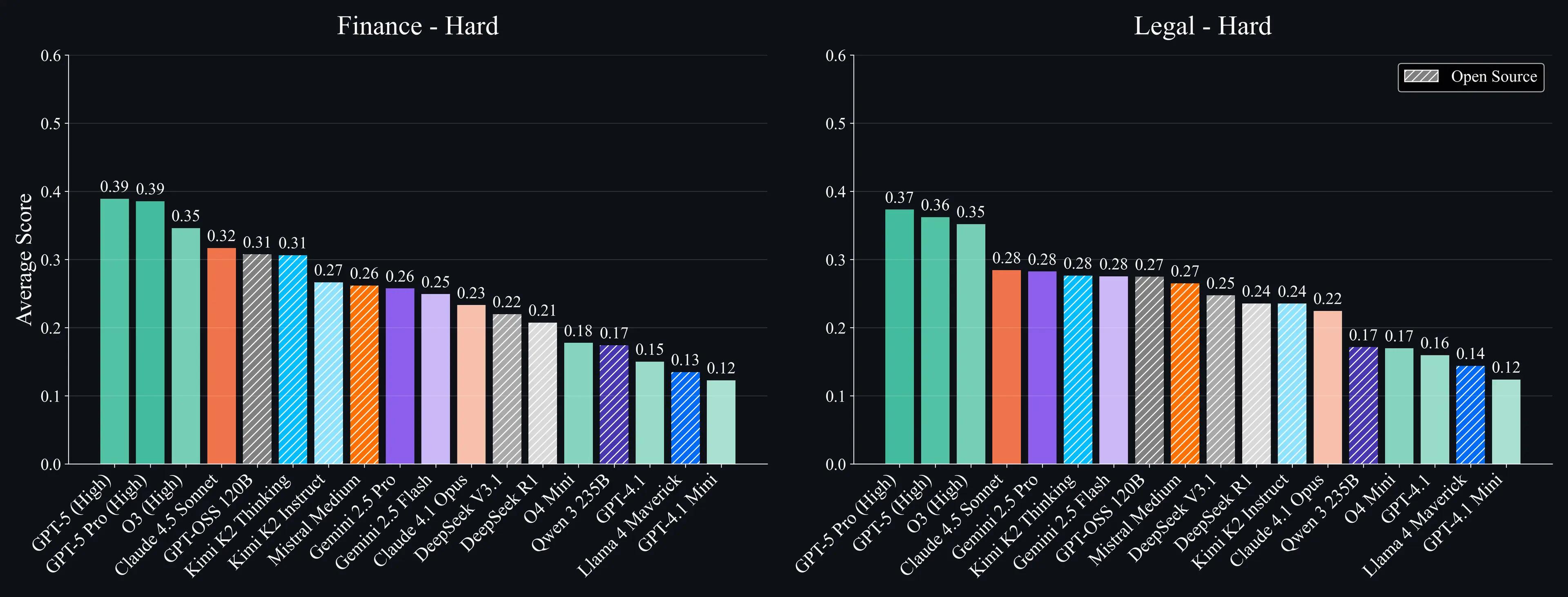 On the "Hard" subset every model's performance drops significantly, with the top score in Finance-Hard falling to 0.39 and in Legal-Hard to 0.37. While many models can handle standard professional queries, they stumble when faced with true complexity. The performance gaps widen in here; for example, in Legal-Hard, the field compresses, with several proprietary and open-source models clustering tightly around 0.25–0.28.