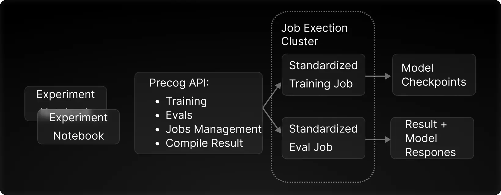 Each Precog experiment is defined in a self-contained notebook that performs any necessary data processing and parameter configuration. The notebook makes API calls to the Precog platform for training, model evals, job management, and compiling results. This makes each experiment reproducible, and allows the Precog platform standardize job hardware configurations, as well as the training and benchmarking logic. This also gives us visibility into all of the current and previous experiments across the company.