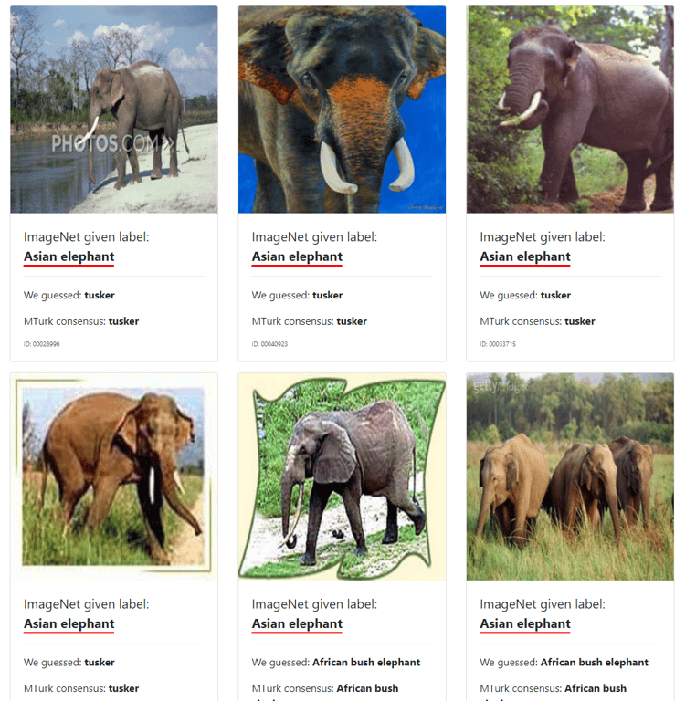 However, as a result of the AWS Mechanical Turk consensus used for the final guess, we can see that their relabeling approach results in errors. For instance, these _are _actually asian elephants and not tuskers.