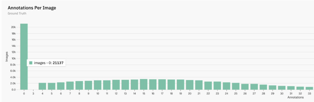 Let’s look at the Insights section of our ground truth dataset and look at the distribution of annotations per image. As we can see, 21337 images have 0 annotations.