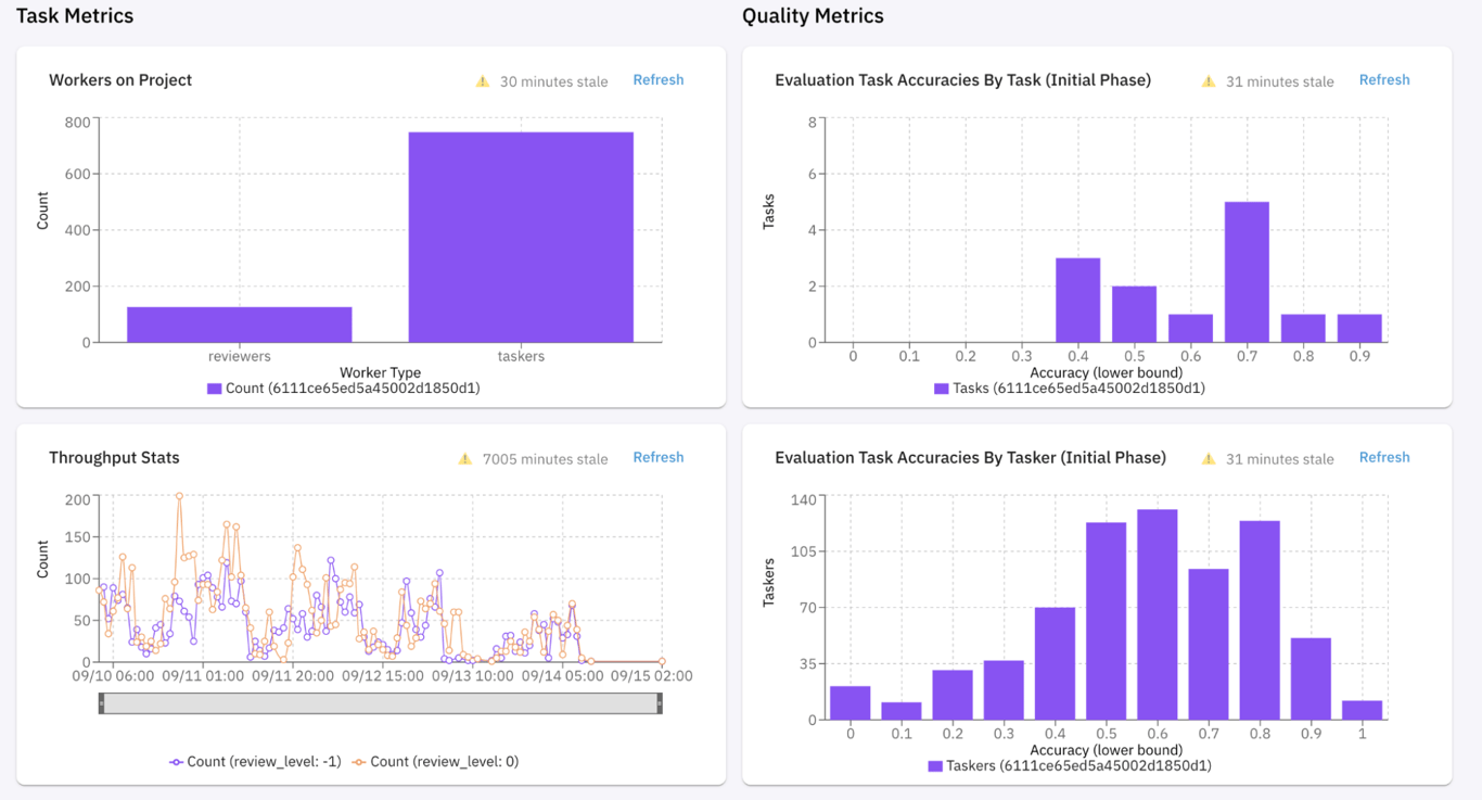 After this calibration batch has been audited, we can send the full set of data we want to be re-labeled. Currently, Rapid only supports batches of size 3000 or less, but we can split our data into two batches and send them separately. After our batches have been labeled, we can see different metrics relating to the task itself and the quality: