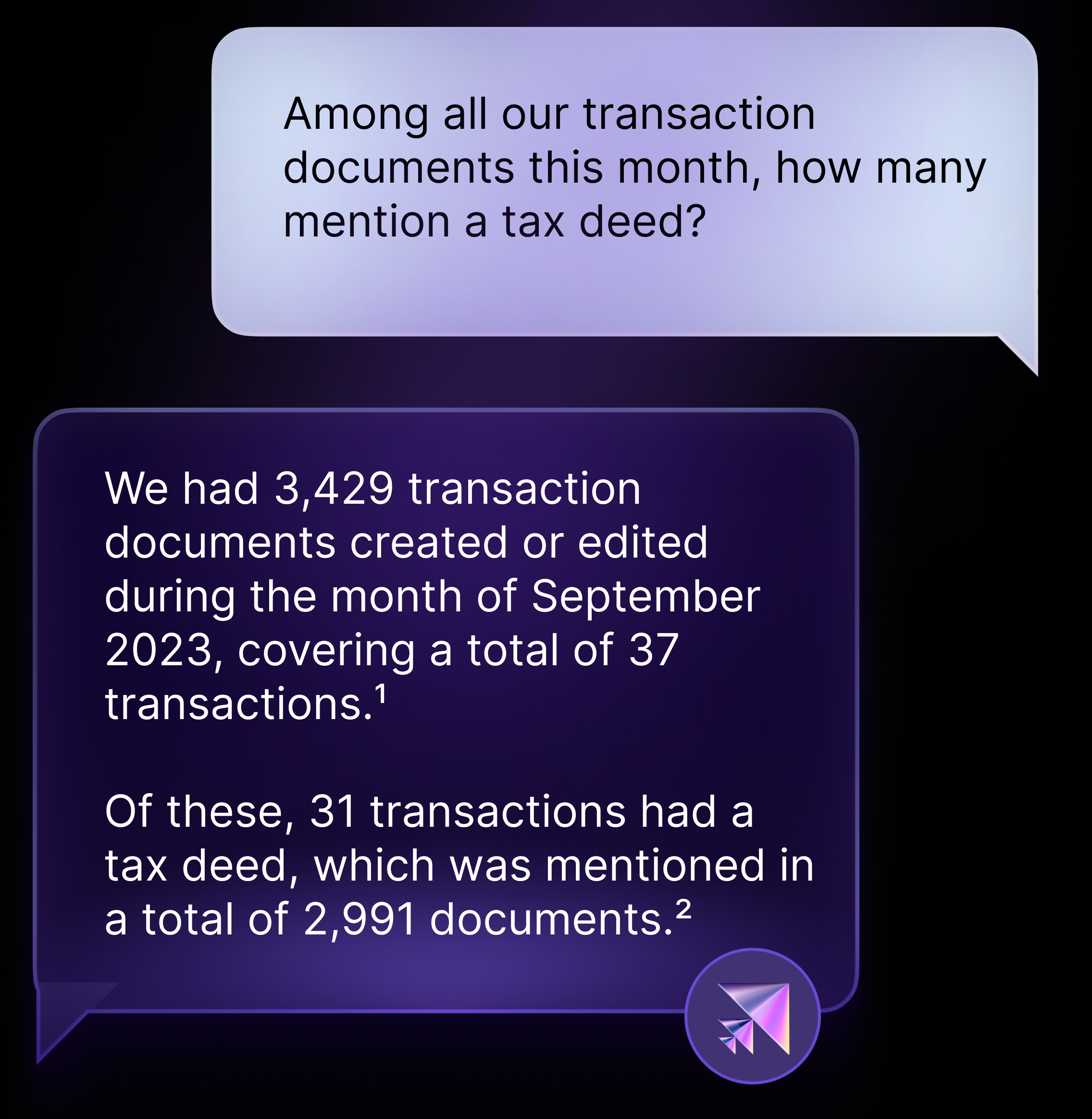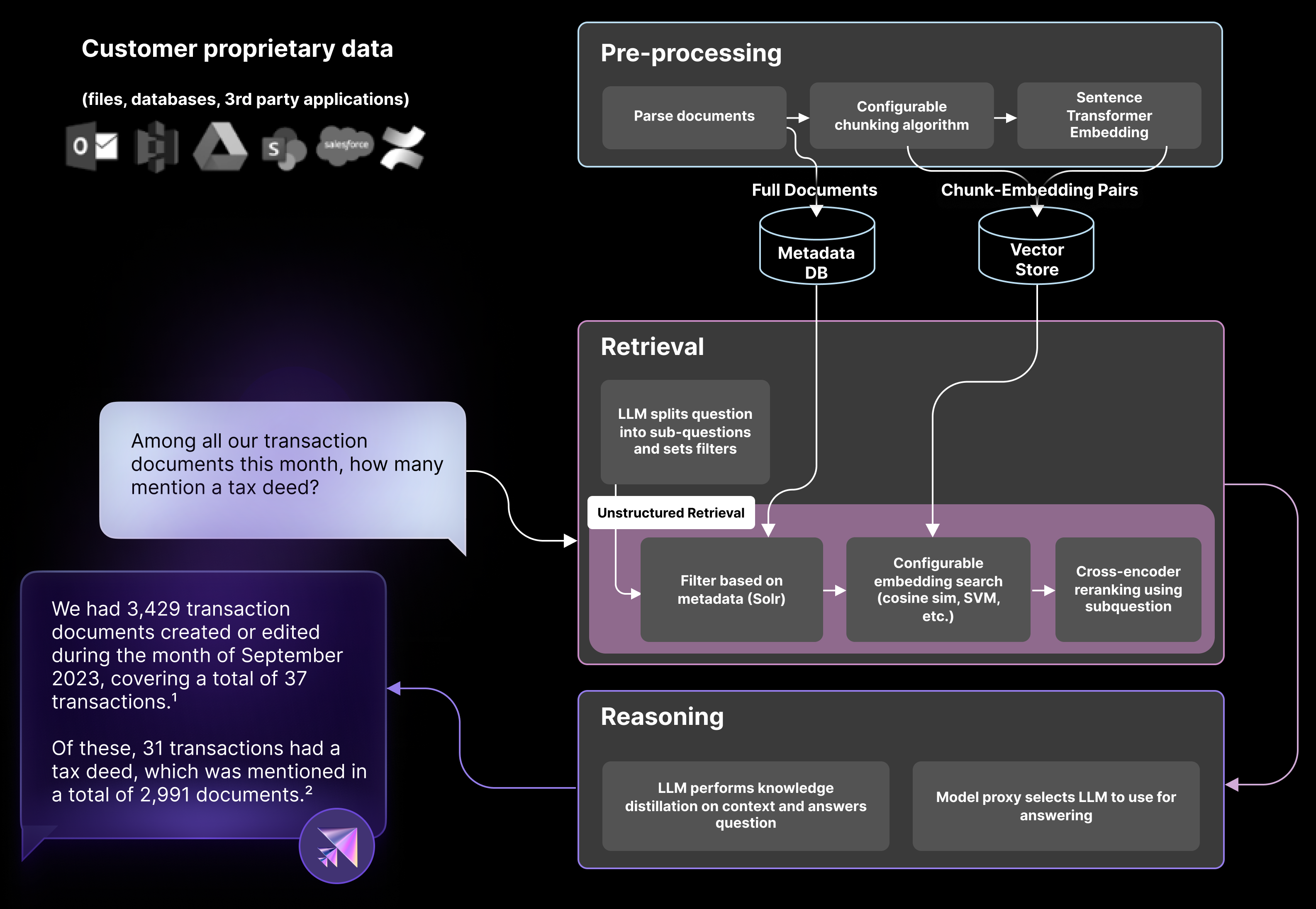 To put everything together, let’s go back to our earlier example. When asking the retrieval augmented LLM the question “How many of our transaction documents last month included a tax deed, we get a very cohesive answer, including citations: