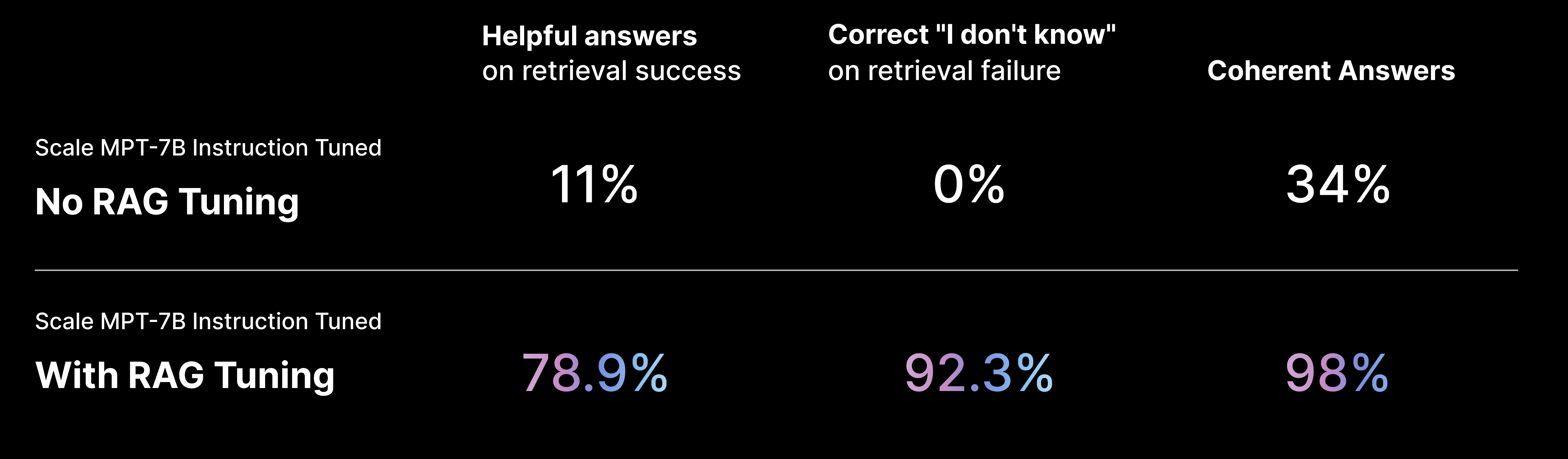For example, at Scale we have fine-tuned an MPT-7B model for RAG using this technique and have observed dramatic improvements on hallucination and “helpful answers”.