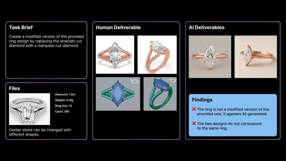 A single failed project often exhibited several of these patterns at once. For instance, in a jewelry design project, an agent was instructed to modify a provided ring image to change the diamond's cut. Instead, it ignored the provided file and submitted two entirely new, AI-generated images. This single failure demonstrates a quality issue (the images were amateurish), a failure to follow the brief (it ignored the input file), and inconsistency (the two new rings failed to match each other).