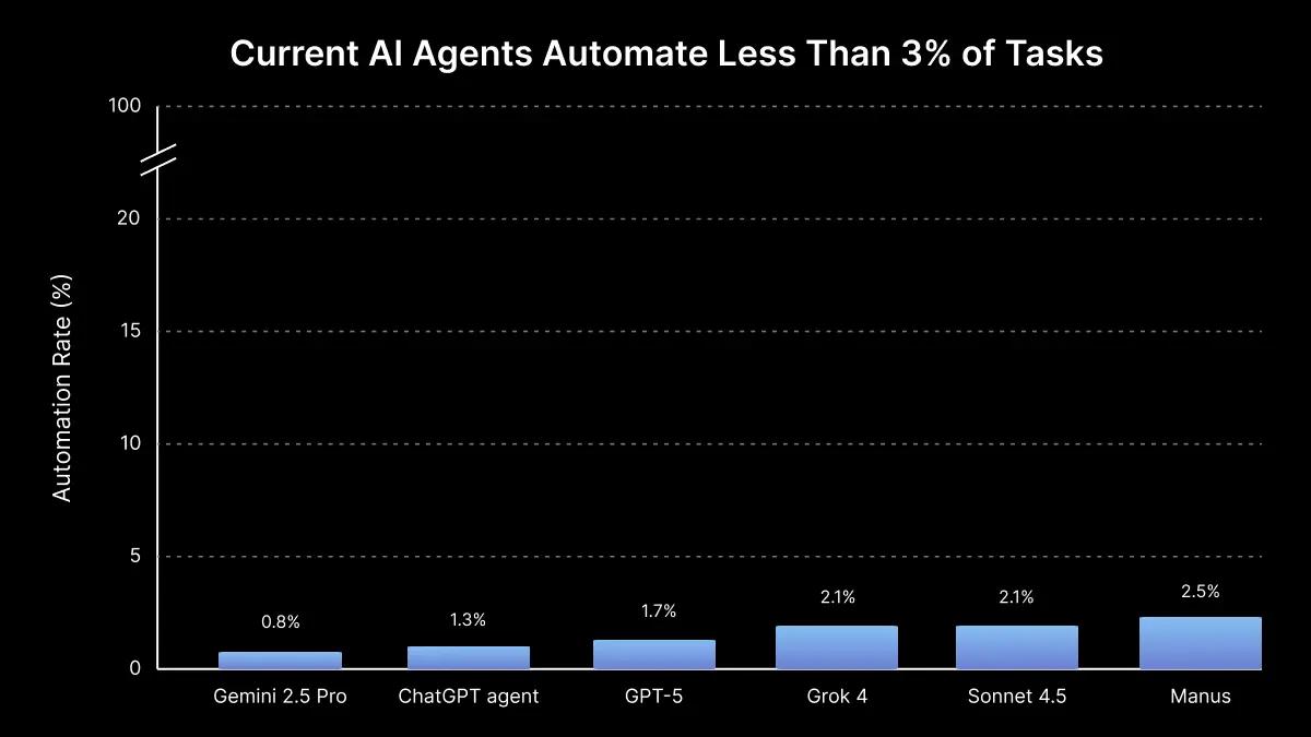 Our research shows that the best-performing AI agents can successfully automate 2.5% of these real-world, paid freelance projects. Across 240 real-world projects spanning 23 domains, the human freelancers who originally completed this work earned a combined $143,991. In contrast, the top-performing agent, Manus, earned $1,720. This 2.5% success rate gives us a crucial starting point for tracking AI's trajectory and grounding public discussion in data.